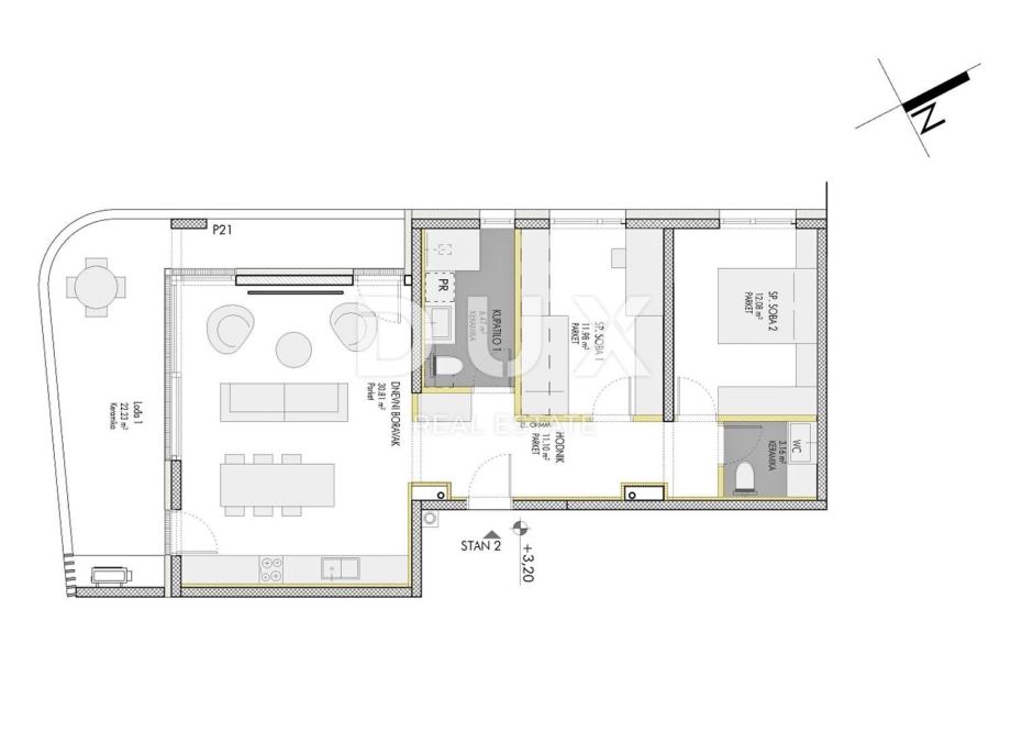 Sastoji se od prostora otvorenog koncepta koji ujedinjuje kuhinju, blagovaonicu i dnevni boravak s izlazom na lođu, dvije spavaće sobe, dvije kupaonice i hodnika.