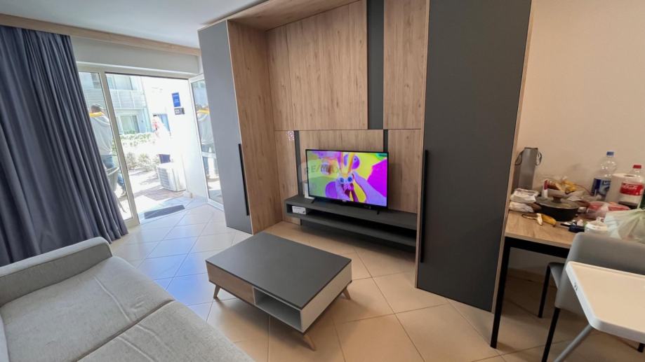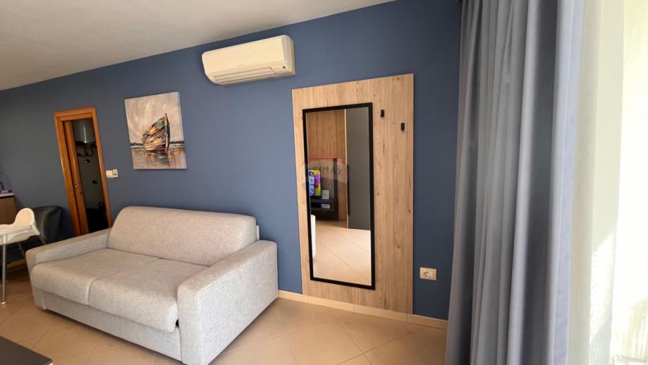 Stan se nalazi u prizemlju, s vlastitim ulazom, i sastoji se od open space prostora koji uključuje dnevni boravak/spavaću sobu, blagovaonicu i kuhinju. Velika staklena stijena pruža obilje prirodne svjetlosti i izlaz na terasu od 17,38 m², savršenu za opuštanje uz pogled na more.
