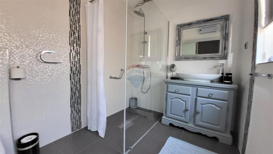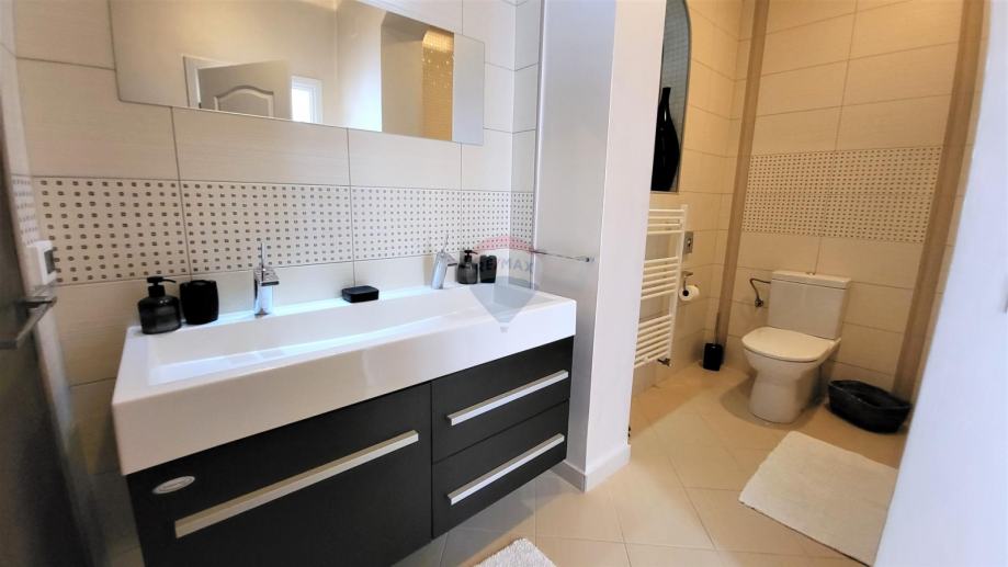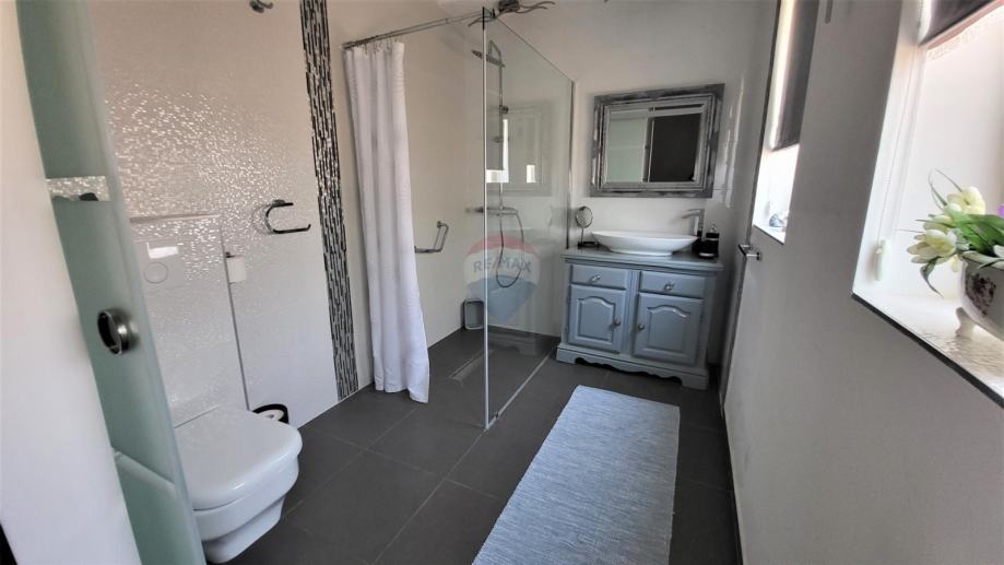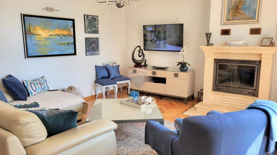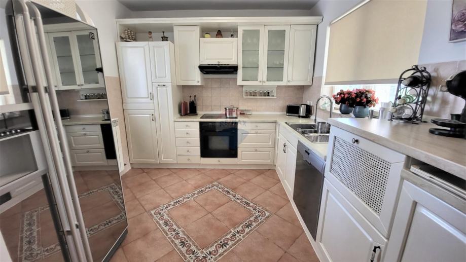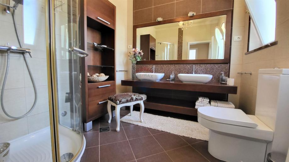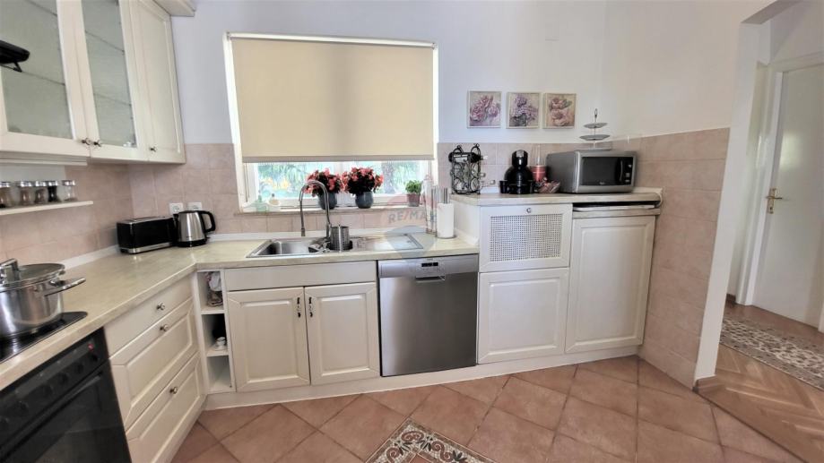 Vila je smještena na zemljištu od 892 m2, savršeno uređene okućnice, bazenom, tušem, sunčalištem, natkrivenom terasom i vanjskim kaminom.