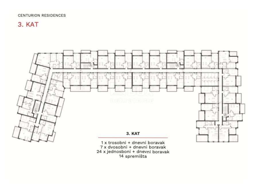 - 24x stanovi s jednom spavaćom sobom, dnevnim boravkom i balkonom