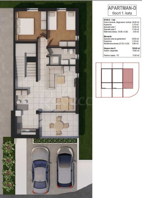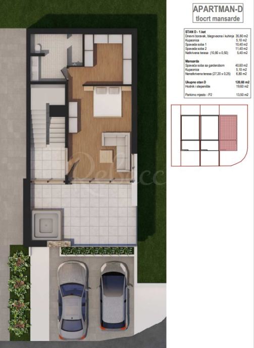 Na sunčanoj lokaciji u mirnom dijelu Zambratije blizu mora i svih savudrijskih plaža prodajemo četverosoban dvoetažni stan koji se nalazi u srednjem nizu dvostambene zgrade (DUPLEXA). Stan je funkcionalan i nalazi se u novoizgrađenoj zgradi. Stan D, će biti gotov do sredine 2024. godine. Sve prostorije u potkrovlju mogu se prilagoditi željenoj namjeni. Stan se sastoji od kuhinje sa blagovaonicom, dnevnog boravka, dvije spavaće sobe, dvije kupaonice, loggie, ostave, prostora za rekreaciju, saune i velike nenatkrivene terase. Stanu pripada jedno parkirno mjesto. PDV uključen u cijenu.