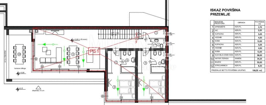 U prizemlju, otkrijte prostrani dnevni boravak s blagovaonicom i kuhinjom, wc, spremište te dvije sobe s vlastitim kupaonicama. Osim toga, tu je i natkrivena terasa koja vodi do bazena od 50m2 i sunčališta, pružajući idealno mjesto za opuštanje i uživanje na otvorenom.