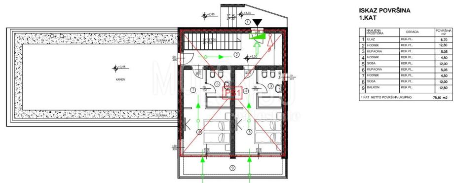 Na prvom katu, nalazi se glavni ulaz u kuću, hodnik te dvije dodatne spavaće sobe s vlastitim kupaonicama i balkonima, pružajući vam intimnost i udobnost na najvišoj razini.