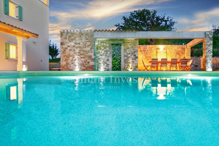 Na predivnoj okućnici nalazi se grijani infinity bazen od 40 m2 sa sunćalištem, jacuzzi, sauna, kupaonica, te terasa sa vrtnom garniturom i vanjskim kaminom, gdje možete uživati u toplim ljetnim mjesecima.