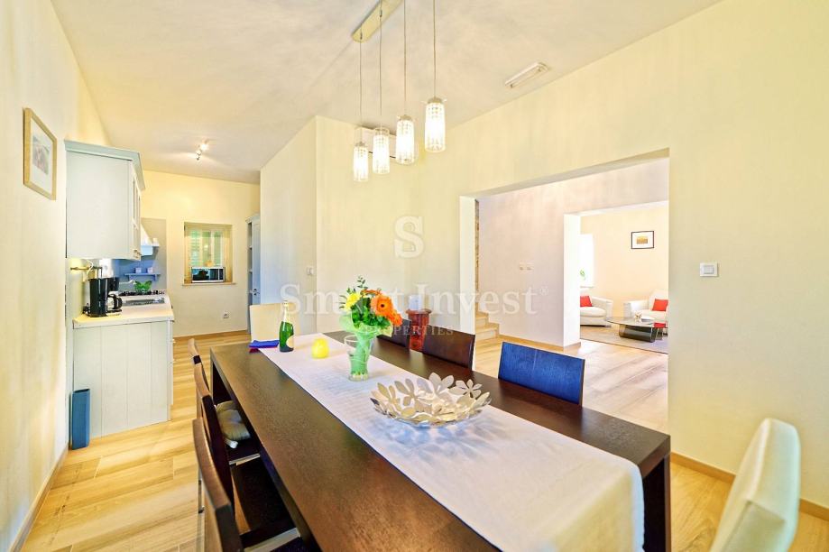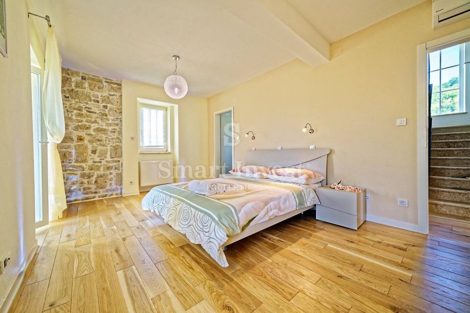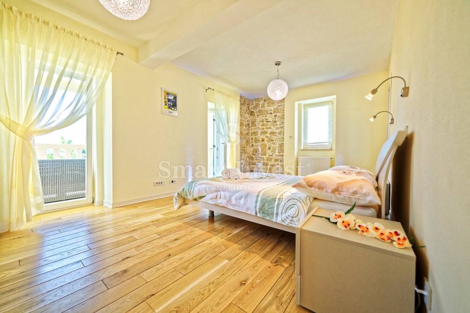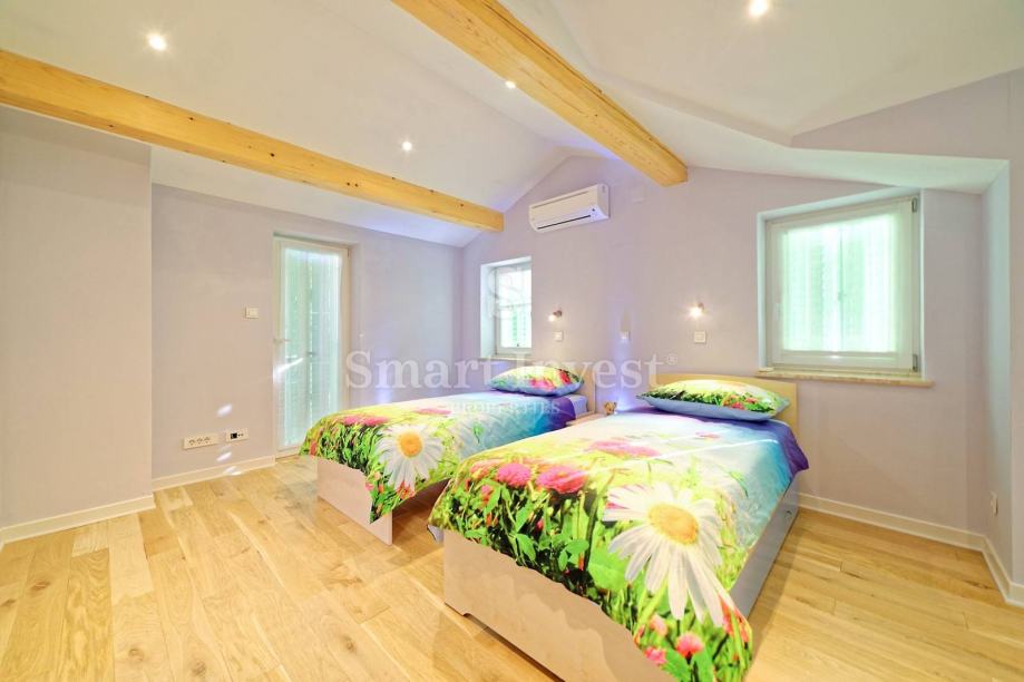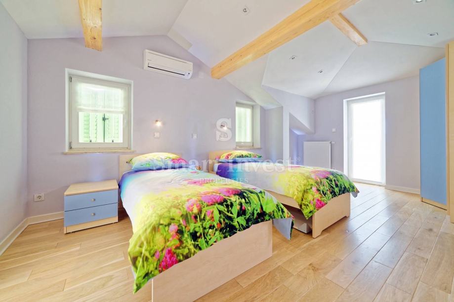 Vila je kompletno opremljena kvalitetnim namještajem i tehnikom, ima centralno solarno grijanje te 6 klima uređaja za grijanje/hlađenje.