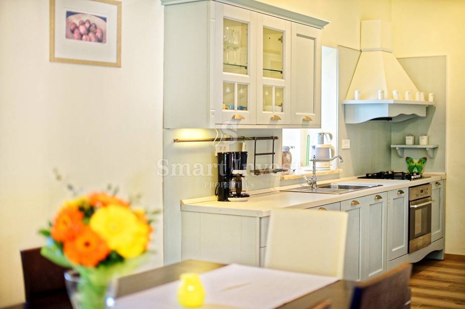 U prizemlju se nalazi kuhinja sa blagovaonicom, dnevni borak, vinoteka i toalet. Na prvom katu su smještene dvije spavaće sobe s vlastitim kupaonicama i izlazom na zajedničku terasu. Na drugom katu su još dvije spavaće sobe s vlastitim kupaonicama. Svaka soba ima izlaz na terasu, sa koje se pruža prekrasan pogled na Motovun, okolne vinograde i netaknutu prirodu.