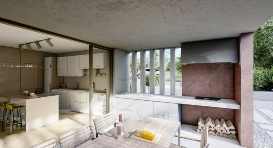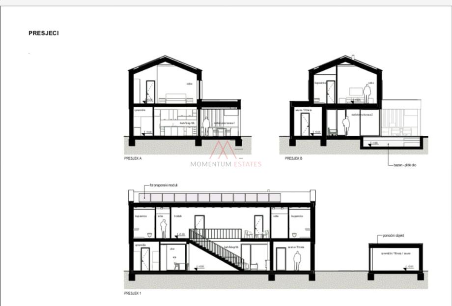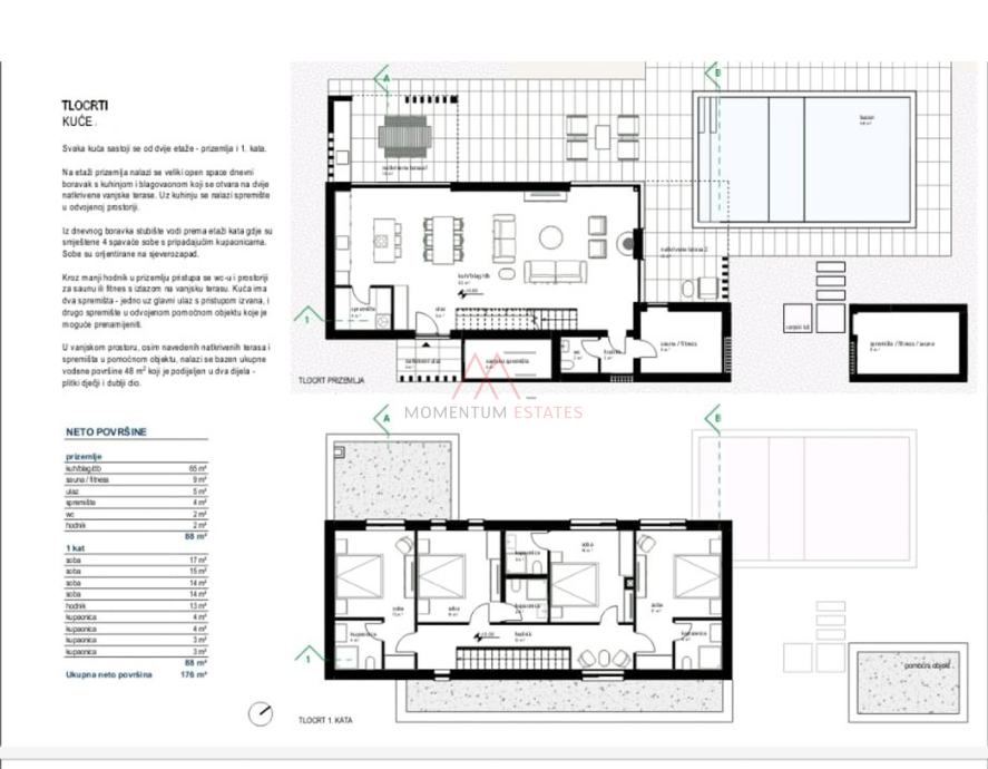 Prizemlje: Uđite u prostrani dnevni prostor s open space konceptom koji uključuje kuhinju, blagovaonicu i dnevni boravak, stvarajući skladnu atmosferu idealnu za zabavu. Na ovoj etaži također se nalaze spremište (unutarnje i vanjsko), prostorija za saunu/fitness, te izlaz na natkrivenu terasu s ljetnom kuhinjom i grijanim bazenom koji uključuje masažni dio, ukupne površine 48 m2.