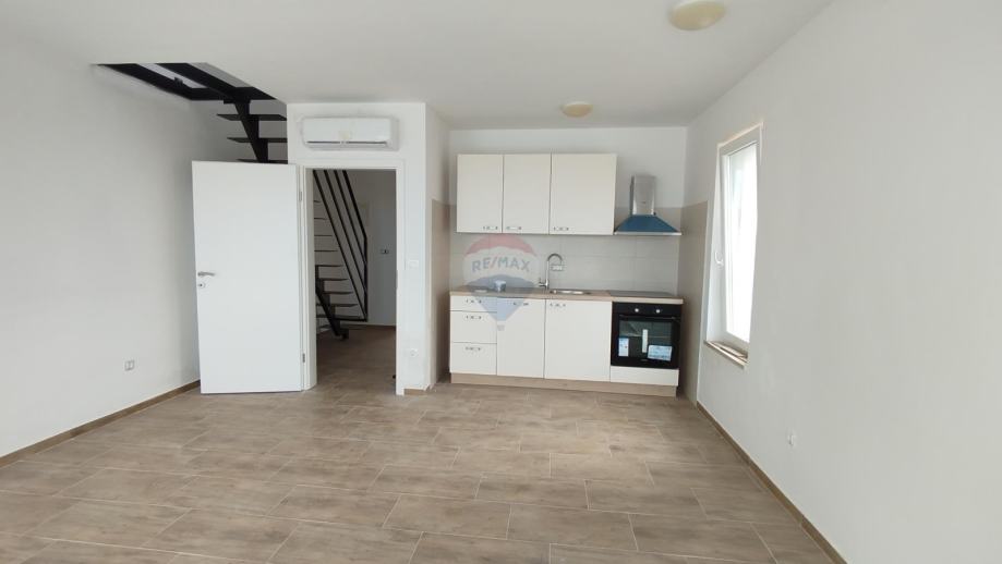 Na donjoj etaži nalazi se kuhinja s blagovaonicom, dnevni prostor i kupaonica, dok su na gornjoj etaži smještene dvije spavaće sobe i dodatna kupaonica. Stan ima pogled na more i nalazi se na vrlo dobroj lokaciji s jednostavnim pristupom svim važnijim sadržajima.