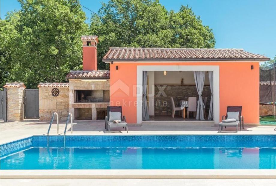 Kuća se nalazi na uređenoj okućnici od 985m2 na kojoj se nalazi ljetna kuhinja sa kupaonom, bazen i igralište za djecu.