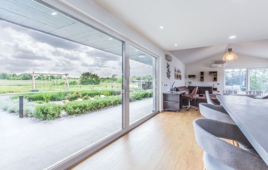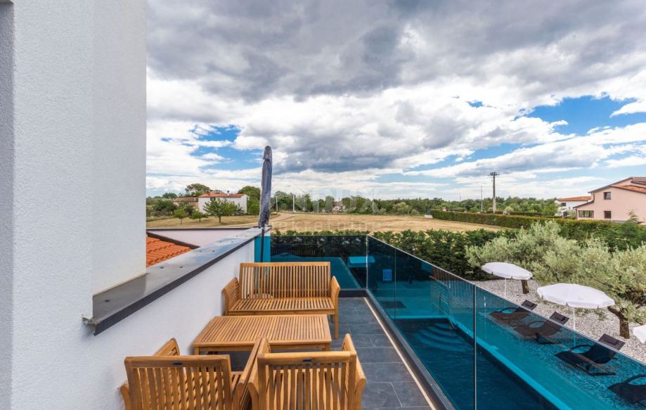 Ova prekrasna moderna vila nalazi se u mirnom i zelenilom bogatom naselju kod Višnjana, samo oko 10 km od centra Poreča i najbliže plaže.