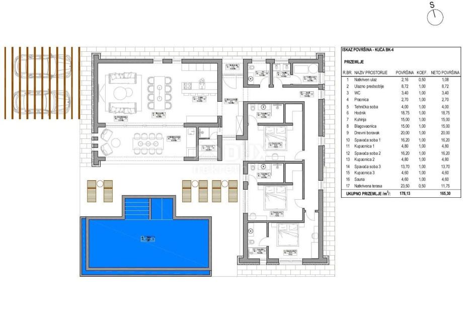 Zatim, odvojene se nalaze tri "ensuite" spavaće sobe (s vlastitim kupaonicama), a uz koje je osigurana brza i jednostavna komunikacija s vanjskim prostorom, odnosno bazenom, ljetnom kuhinjom i zelenom površinom. Ako svemu tome pridodamo još i prostor za saunu kao i dizajn interijera s visoko kvalitetnim i potpisanim namještajem možemo reći kako priča poprima onaj oblik koji renomirani investitor želi postići sa svakom svojom izvedbom.