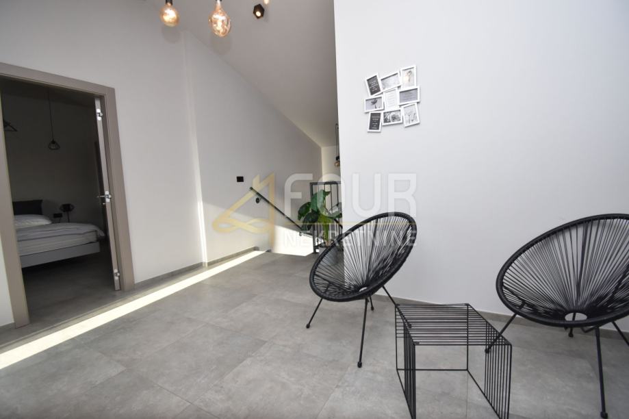 Prizemlje se sastoji od otvorenog prostora u kojem je smještena moderna kuhinja s otokom, velika blagovaonica i dnevni boravak s kaminom te spavaća soba s kupaonicom.