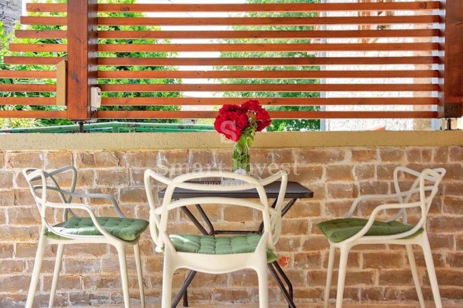 Iako mala, djelomično natkrivena terasa ispred kuće, dovoljna je za jutarnje ispijanje kave ili večernje čaše vina.