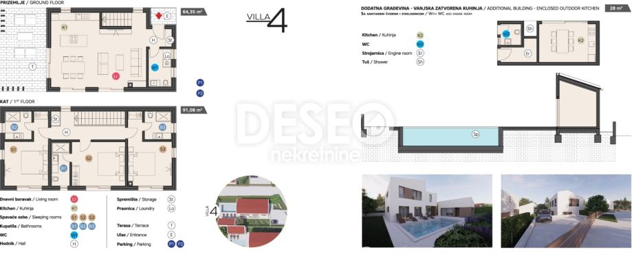 Sama vila ima 155,43 m2, a nalazi se na zemljištu veličine 498 m2. Sastoji se od prizemlja gdje su dnevni boravak, kuhinja, kupaona i velika terasa veličine 24 m2, a na katu se nalaze tri spavaće sobe, te svaka sa kupaonom. Na okućnici je bazen veličine 30 m2 i zasebna vanjska zatvorena kuhinja sa toaletom, tušem i spremištem veličine 28 m2.