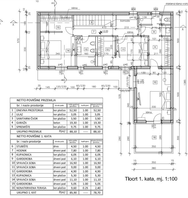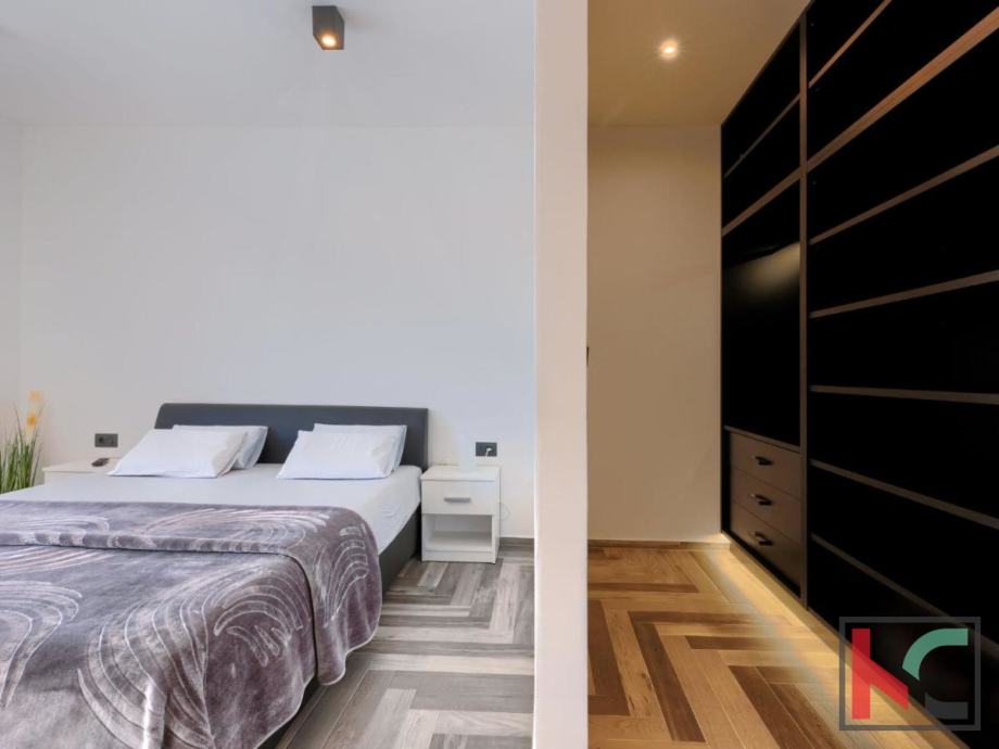 Prizemlje vile ima otvoreni koncept koji obuhvaća kuhinju, blagovaonicu i dnevni boravak, stvarajući prostran i svijetao prostor za druženje i obiteljske aktivnosti. Na ovoj razini nalaze se i hodnik, moderna kupaonica te garaža s izravnim ulazom u kuću. Prvi kat vile nudi tri prostrane spavaće sobe, od kojih dvije imaju vlastite walk-in ormare, savršene za organizaciju i dodatnu udobnost. Dvije luksuzno uređene kupaonice dodatno naglašavaju visoku kvalitetu interijera.