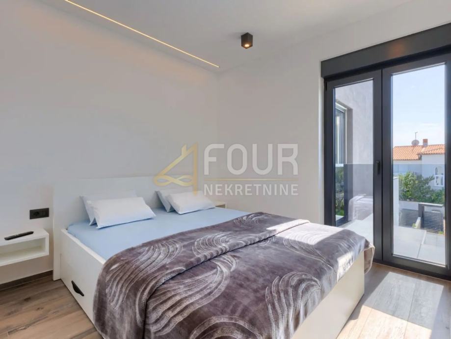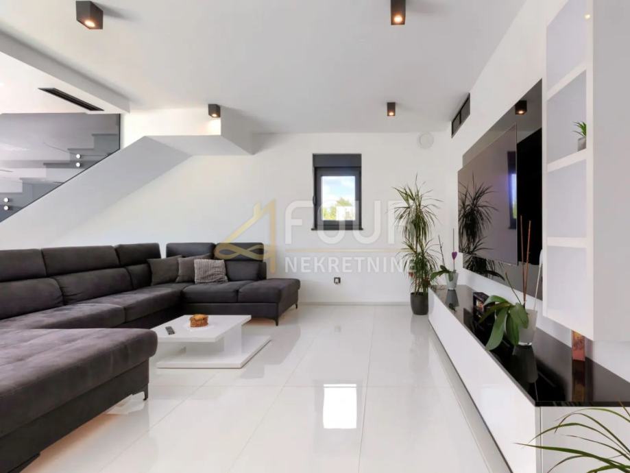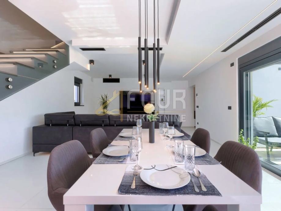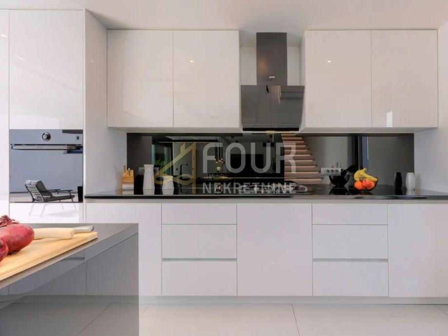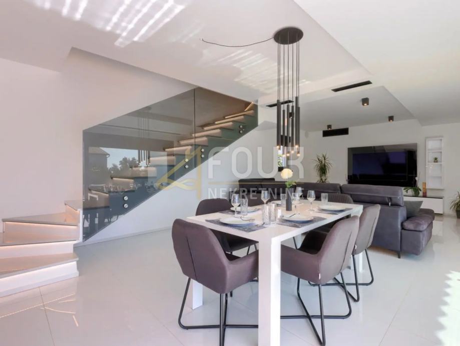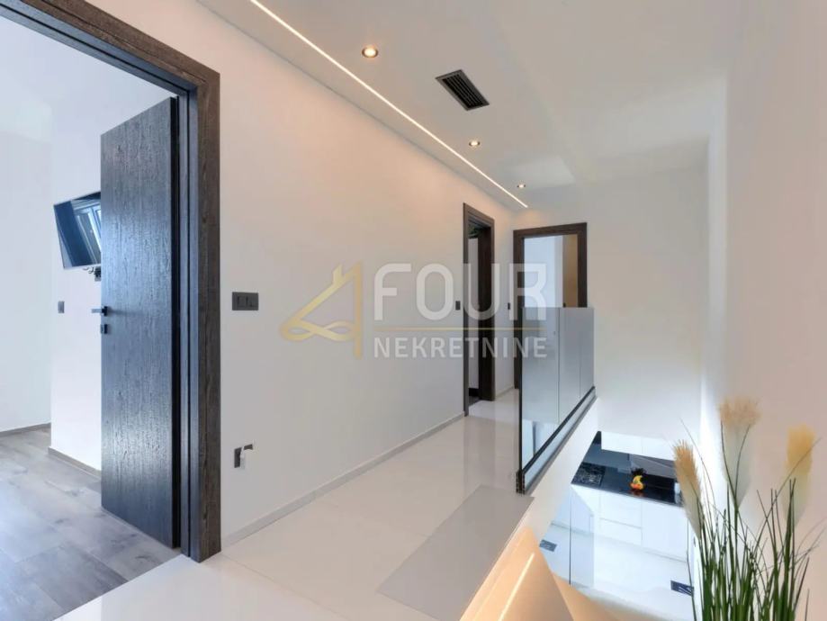 Prizemlje kuće se sastoji od hodnika, kuhinje s blagovaonicom, dnevnog boravka, kupaonice, spremišta i garaže. Iz garaže se direktno ulazi u hodnik. Na prvom katu se nalaze dvije spavaće sobe s garderobom i jedna master soba sa garderobom i kupaonicom iz koje se izlazi na terasu koja ima pogled na more.