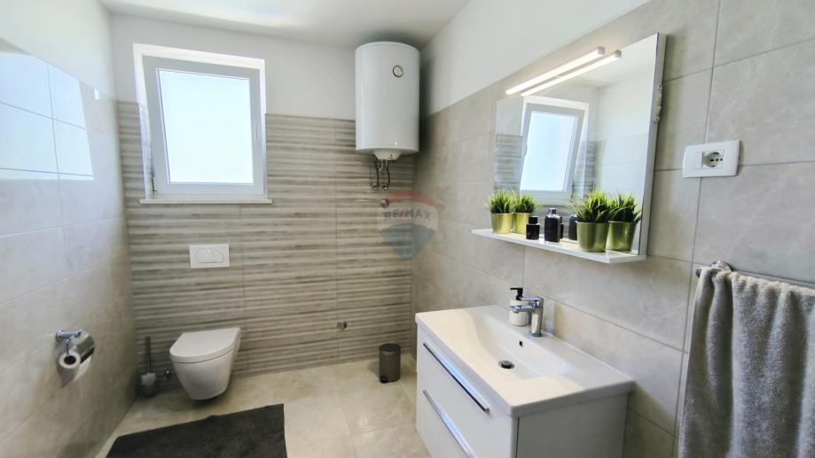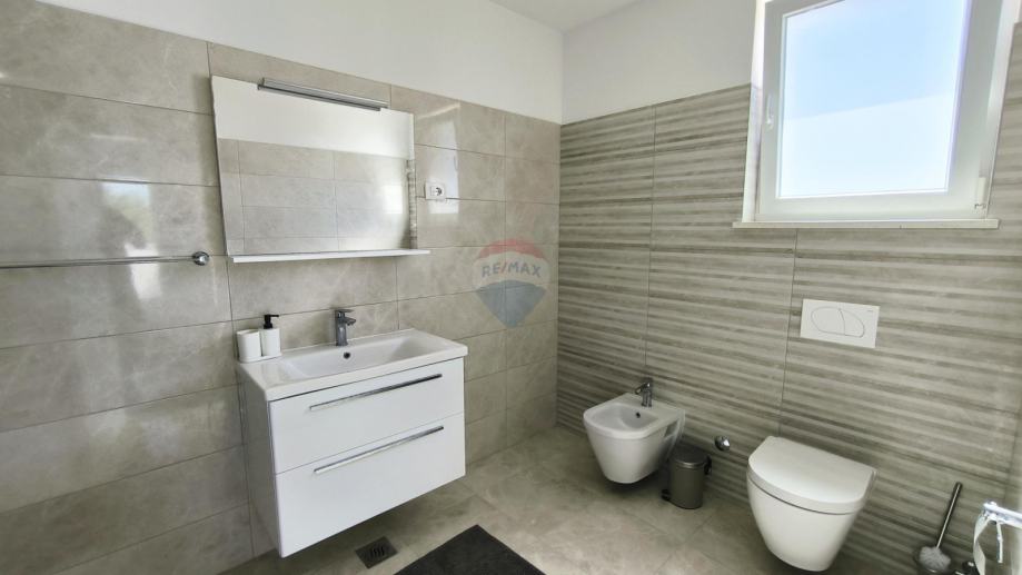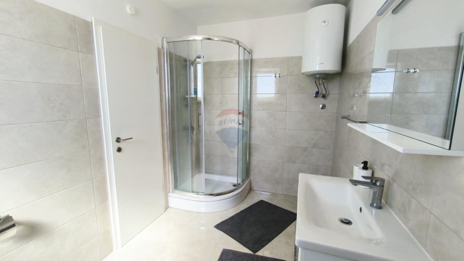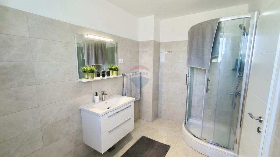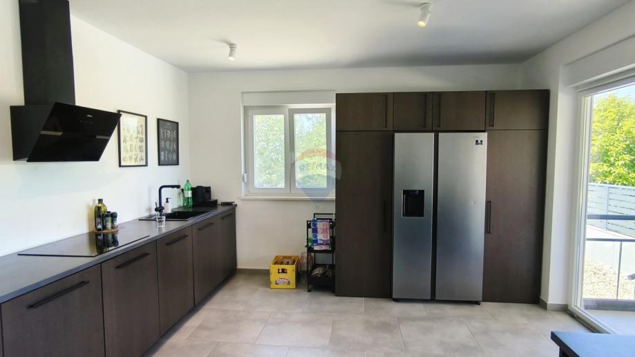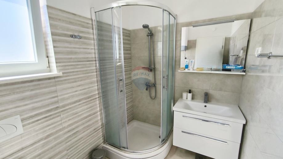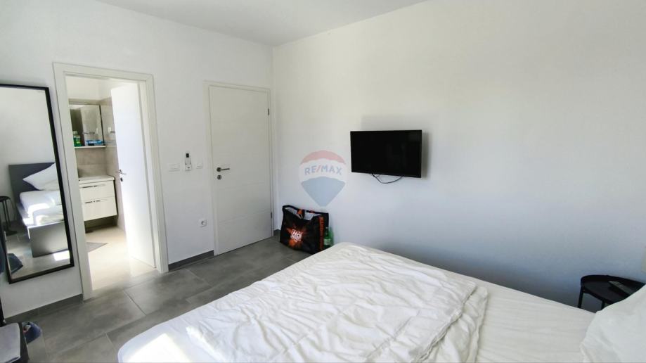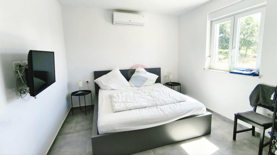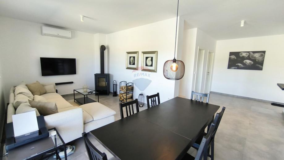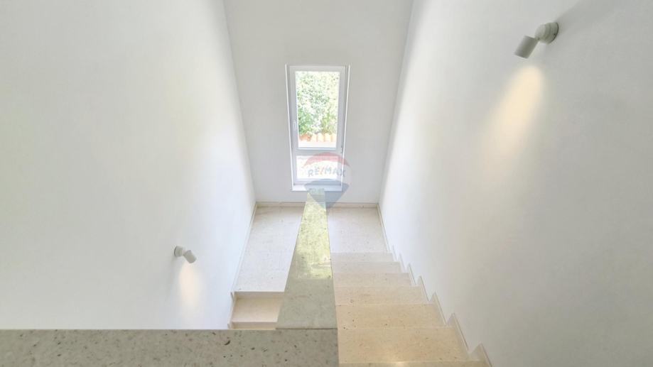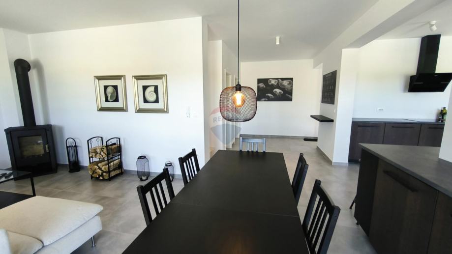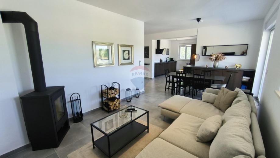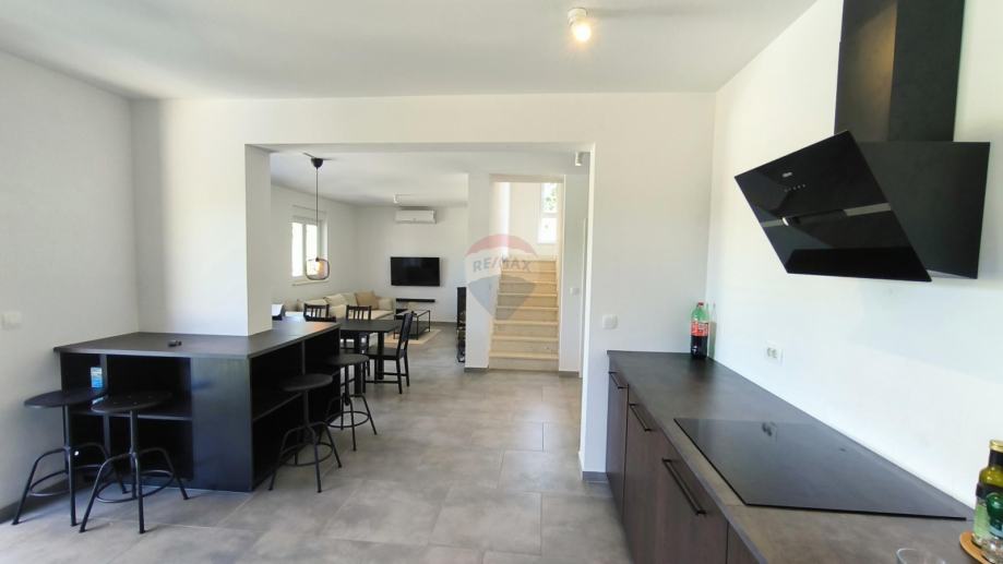 U prizemlju se nalazi suvremeno oblikovan otvoreni koncept s prostranom kuhinjom, blagovaonicom i dnevnim boravkom. Tu je i jedna spavaća soba s vlastitom kupaonicom, gostinjska kupaonica te praktična ostava. Iz dnevnog boravka i kuhinje izlazi se na natkrivenu terasu s roštiljem i vanjskom blagovaonicom, koja pruža pogled na bazen i zelenilo.