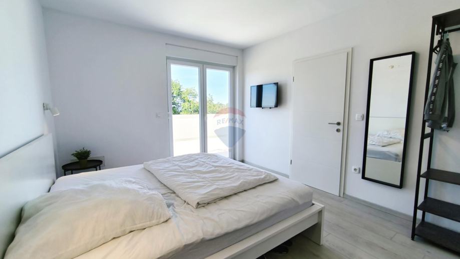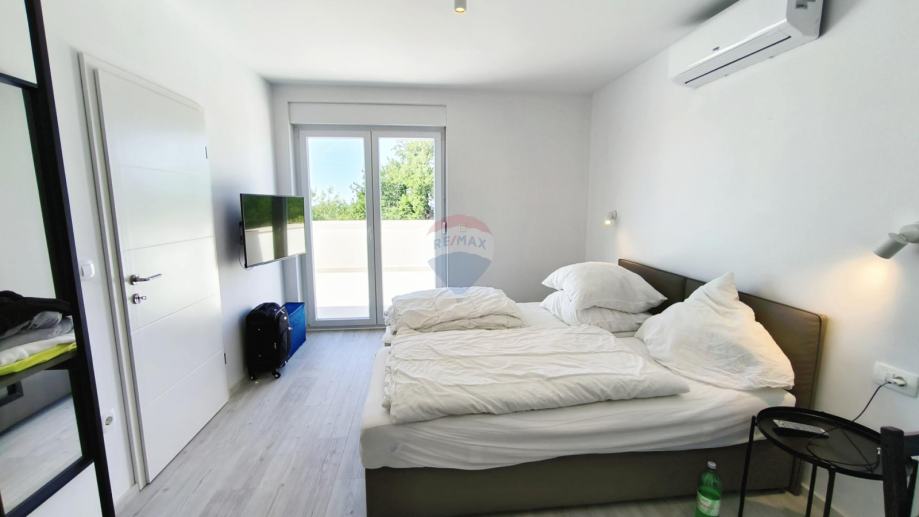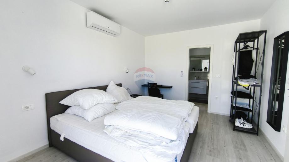 Na gornjoj etaži nalaze se dvije komforne spavaće sobe, svaka s vlastitom kupaonicom i izlazom na veliku terasu koja nudi panoramski pogled na prirodu, bazen i djelomičan pogled na more.