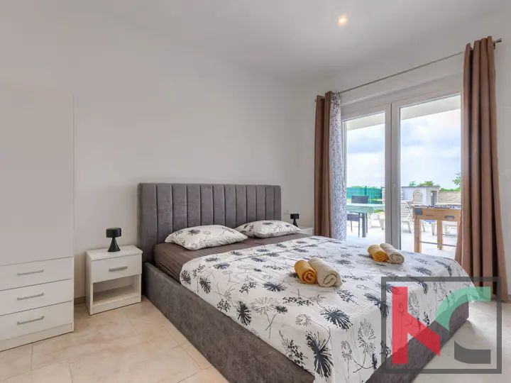Sastoji se od ulaznog hodnika, tehničke sobe, tri spavaće sobe od kojih jedna ima izlaz na terasu - dvorište sa bazenom i sunčalištem dvije kupaonice te open space dnevni boravak u komunikaciji sa kuhinjom i blagovaonicom sa izlazom na istu terasu.