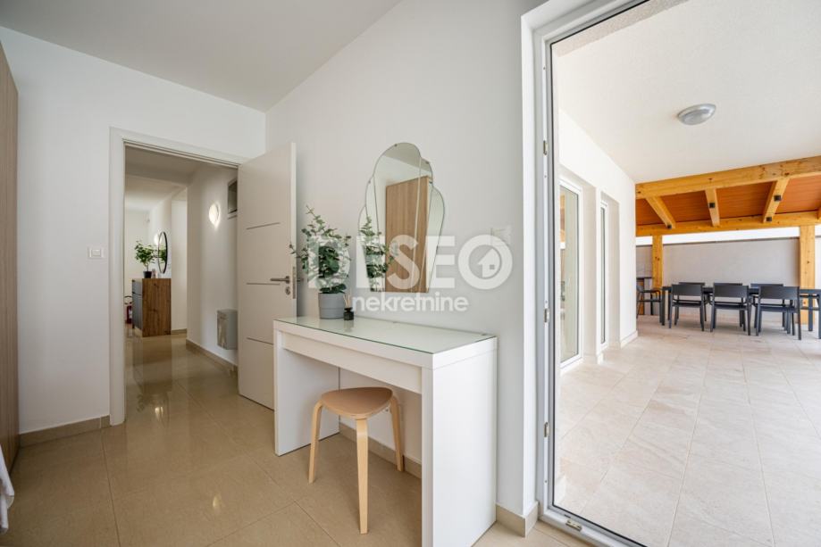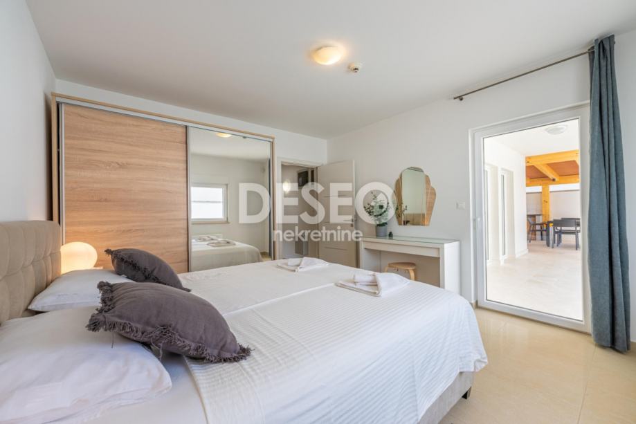 - prizemlja : ulazni hodnik, dnevni boravak, kuhinja s blagovaonom, jedna spavaća soba, kupaona i terasa s koje se izlazi na okućnicu s bazenom veličine 28m2.