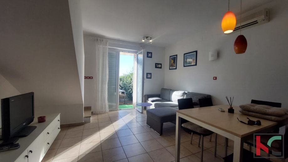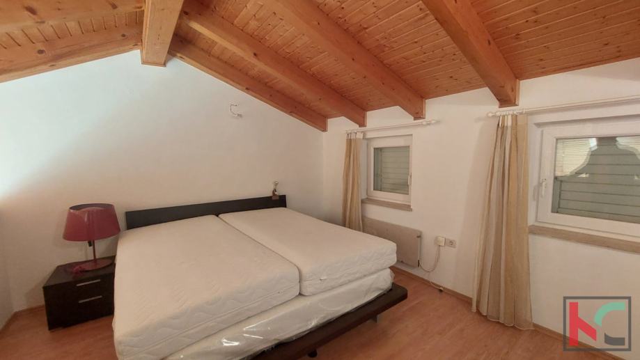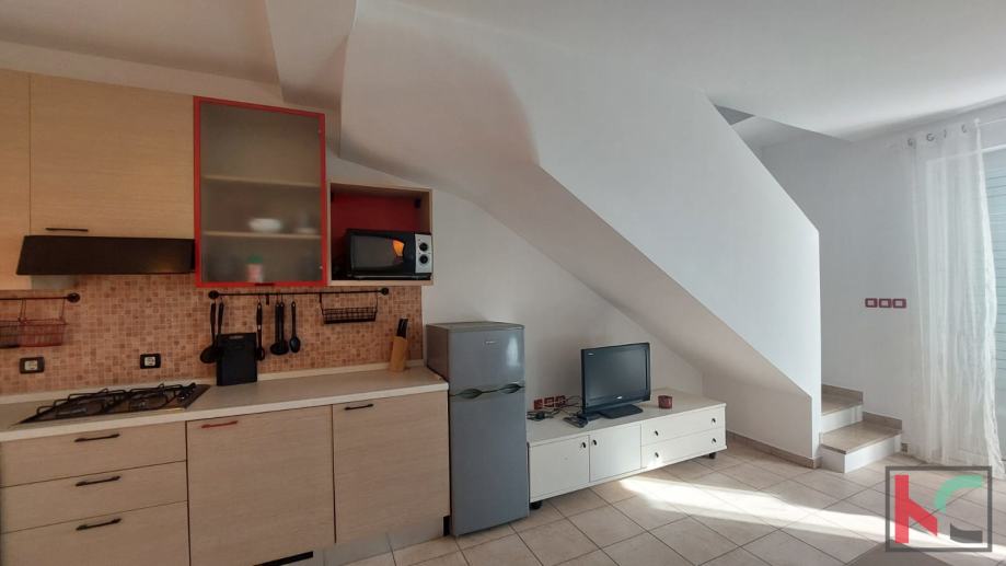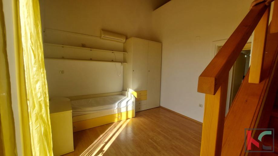 Površine 80,79m2 stan se proteže na tri etaže te se sastoji od ulaznog hodnika, kupaonice, open space prostora sa kuhinjom, blagovaonicom i dnevnim boravkom sa izlazom u dvoriste.. Na drugoj etaži stana nalaze se dvije spavaće sobe od kojih jedna ima izlaz na balkon sa pogledom na more i kupaonica. Iz jedne sobe stepenište vodi u galeriju koj aje prenamjenjena u još jednu prostranu spavaću sobu.