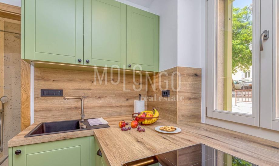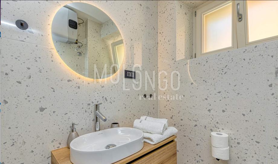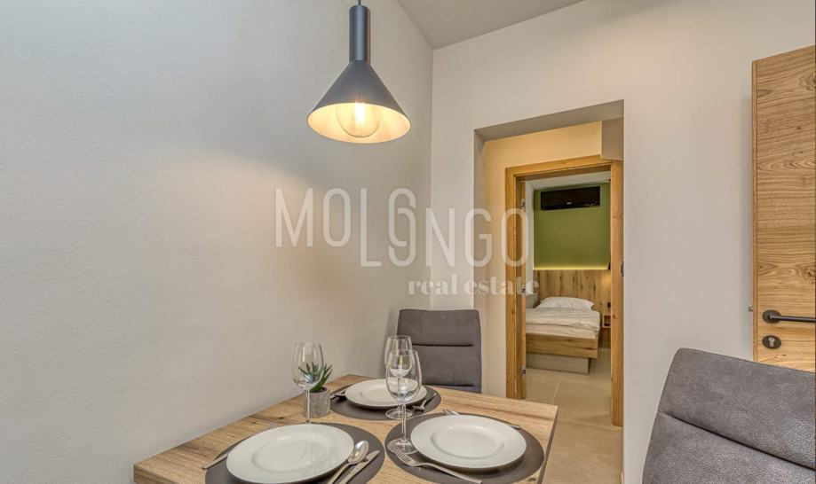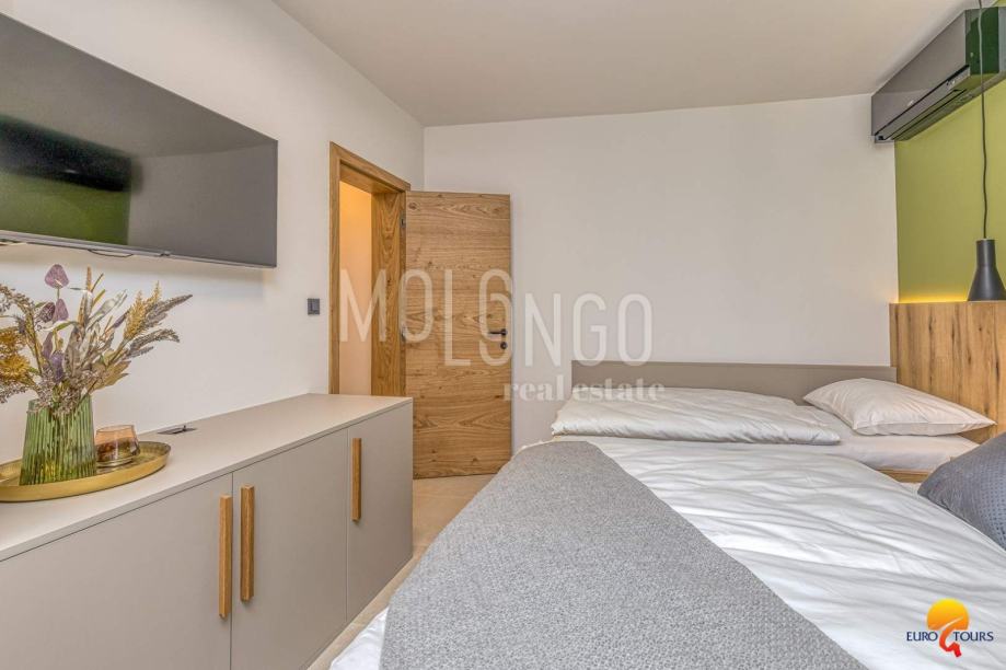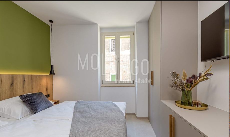 Svi apartmani su novo renovirani i opremljeni kvalitetnim namještajem. Kuća se sastoji od četiri cjeline, međusobno povezane unutarnjim stepenicama. Svaki stan i podrum imaju otprilike 30 m2 te se sastoje od jedne spavaće sobe, potpuno opremljene kuhinje i vlastite kupaonice. Apartman u prizemlju i na prvom katu sastoji se od odvojene spavaće sobe s bračnim krevetom i krevetom za jednu osobu, kuhinje s blagovaonom, te kupaonice opremljene tušem. Na drugom i trećem katu nalazi se studio apartman s jednom spavaćom sobom, dnevnim boravkom, blagovaonom i kupaonom. Perilica rublja i dodatni wc nalazi se u suterenu i na korištenje je svim korisnicima apartmanske kuće. Klima uređaji se nalaze u svim apartmanima.