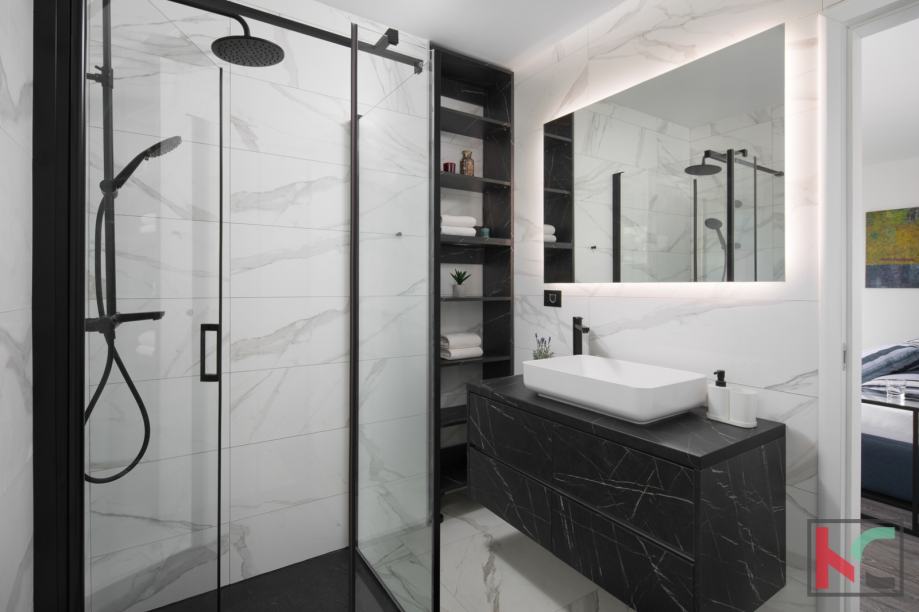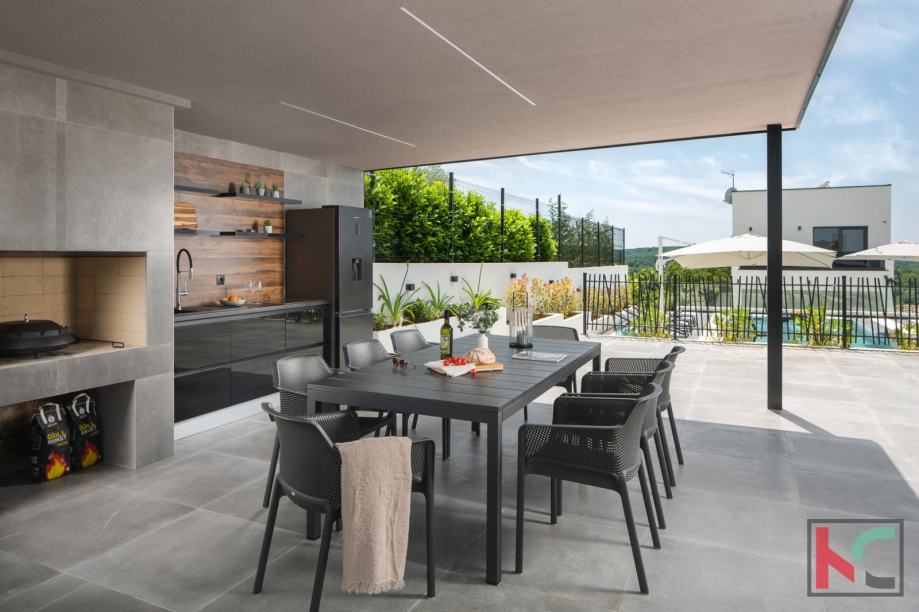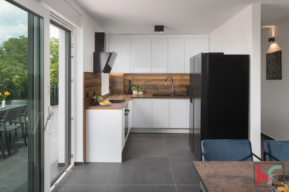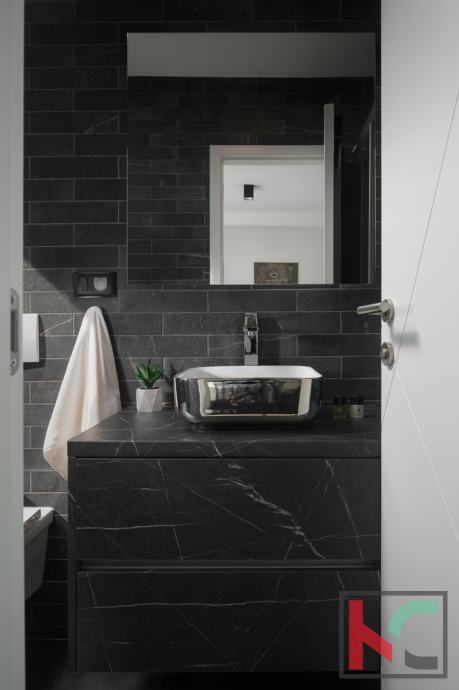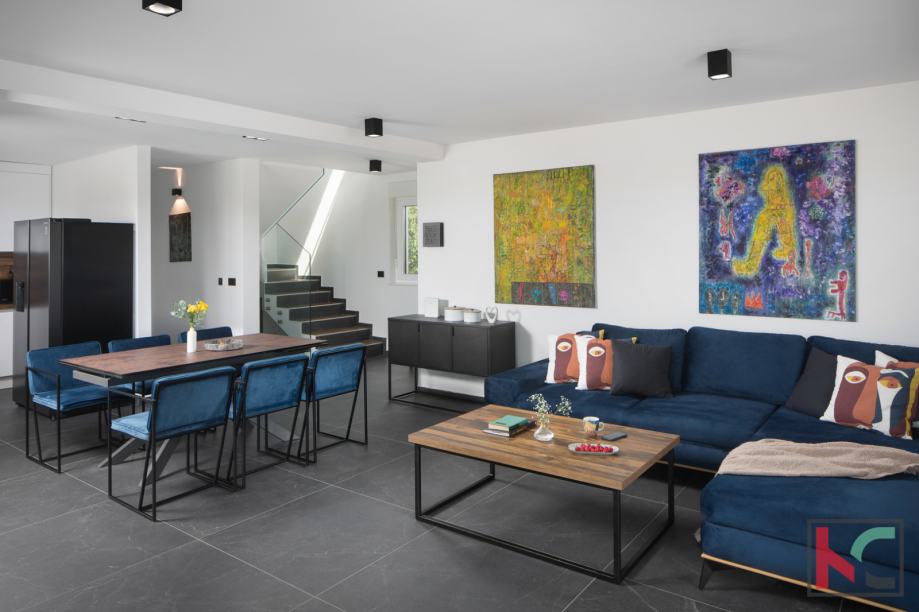 Unutrašnjost kuće pažljivo je opremljena kako bi zadovoljila sve vaše potrebe, uključujući modernu kuhinju s aparatima, perilicu posuđa i perilicu rublja. Udobnost je dodatno naglašena podnim grijanjem, dizalicom topline i klima uređajima.