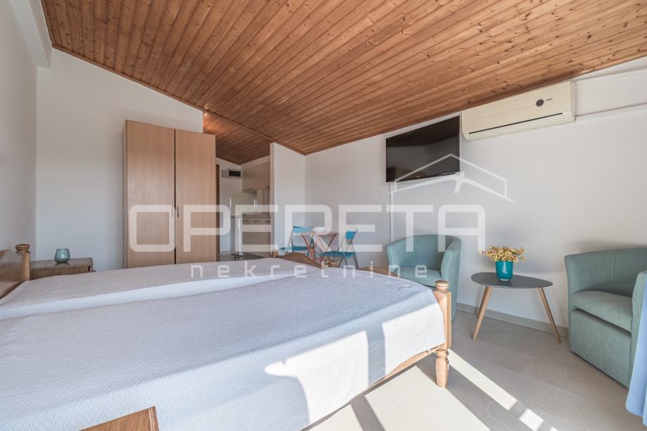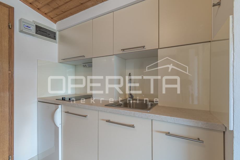 Garsonijera je osmišljena kao jedinstven, otvoren prostor koji spaja blagovaonicu i potpuno opremljenu kuhinju. Odvojena i uređena kupaonica pruža sve potrebno za svakodnevnu upotrebu.