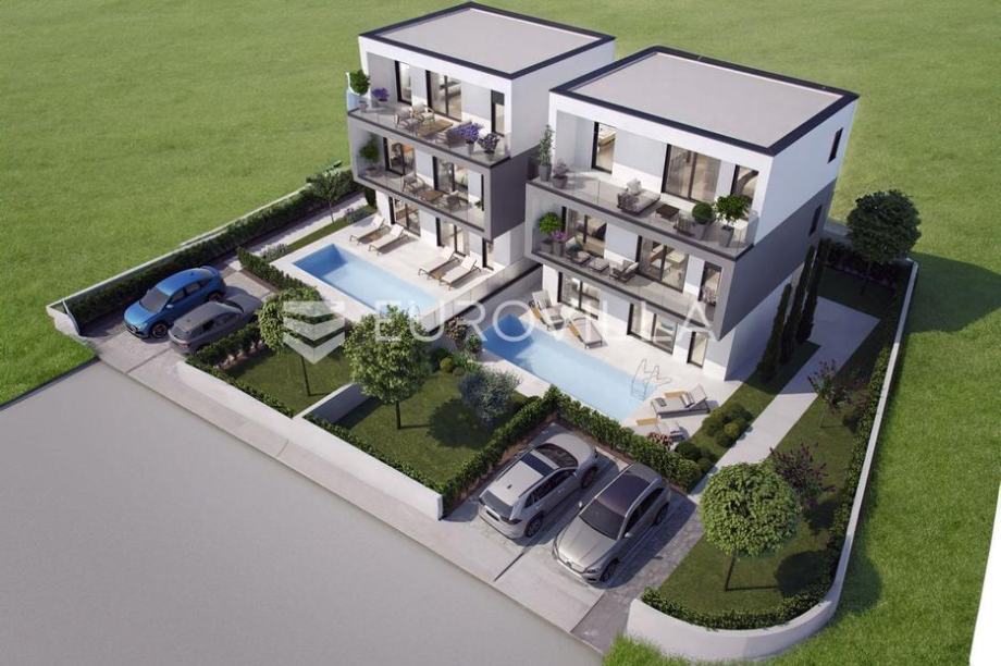 Istra, Žbandaj, moderna dvojna kuća s pogledom na more i bazenom (prodaja)