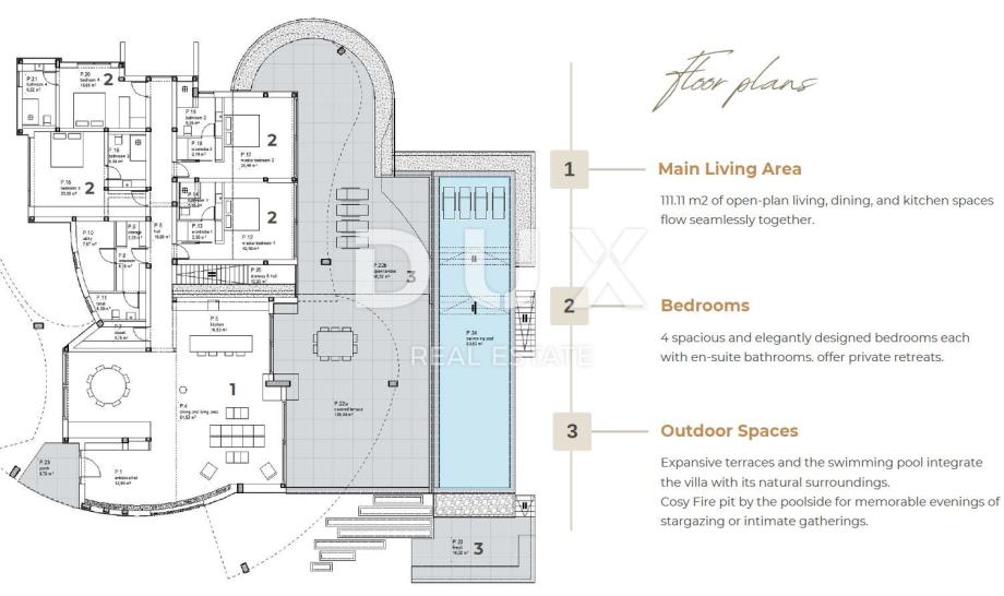 Srce vile čini impozantan open-space prostor koji ujedinjuje dnevni boravak, kuhinju i blagovaonicu, koji se protežu na čak 111.11 m², stvarajući osjećaj prostranosti i povezanosti. Velike staklene stijene donose obilje prirodne svjetlosti te pružaju odličnu komunikaciju s vanjskim ambijentom. Dugačak hodnik u nastavku odlično povezuje dnevni sa spavaćim dijelom vile. 4 komforne spavaće sobe, svaka sa svojom luksuznom kupaonicom, daju osjećaj privatnosti i ugode svim članovima obitelji. Dvije spavaće sobe su master spavaće sobe sa vlastitim walk in ormarima, čime se dodatno osigurava funkcionalnost i praktičnost. Dostupna je i utility soba-vešeraj, a za goste tu je i gostinjski toalet.