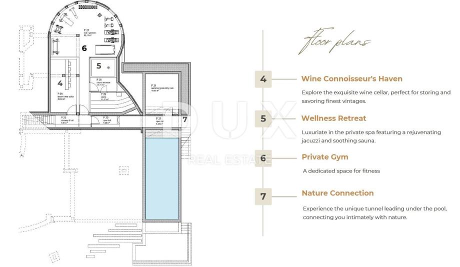 Ako ste strastveni ljubitelj vina ili pak sommelier, ekskluzivna vinarija biti će Vaša najdraža prostorija u vili, u kojoj ćete sa zadovoljstvom ispijati i degustirati vina. Nakon degustacije opustite se u jacuzziju s Vašim najmilijima, a saunu iskoristite kao šećer na kraju. Za ljubitelje sporta i rekreacije, dostupna je teretana od čak 56 m2. Posebna atrakcija je tunel koji prolazi ispod bazena te Vas vodi na prostranu, privatnu okućnicu površine 1.4 hektara.