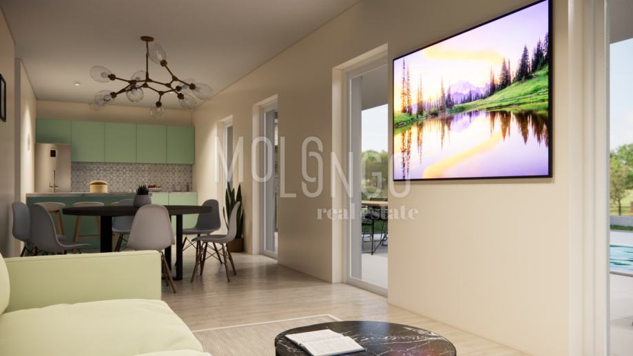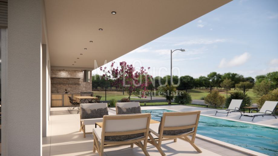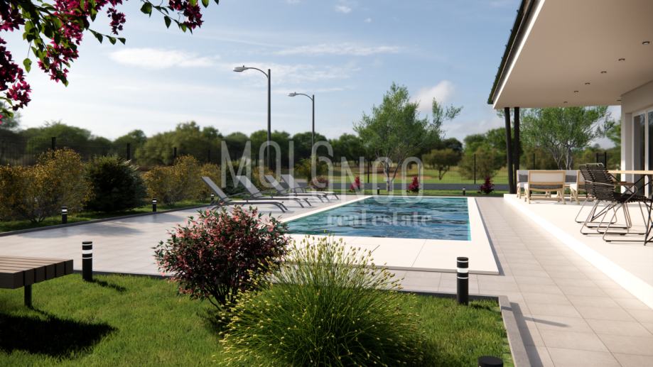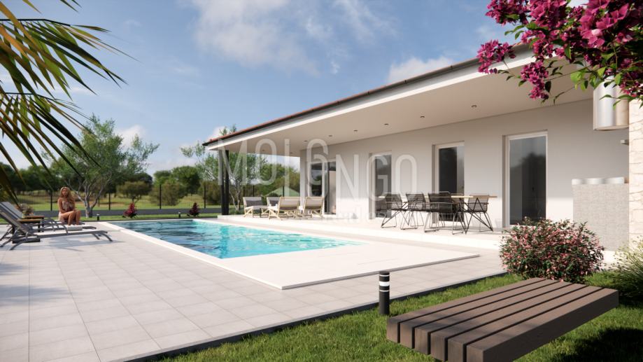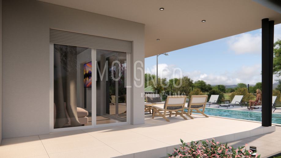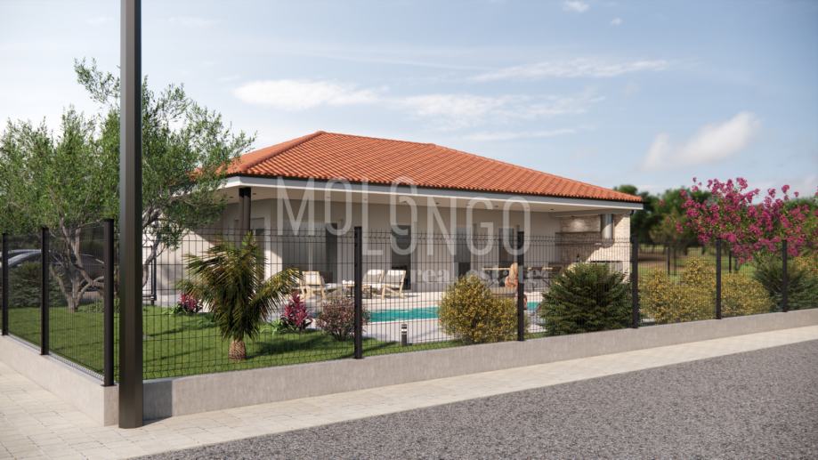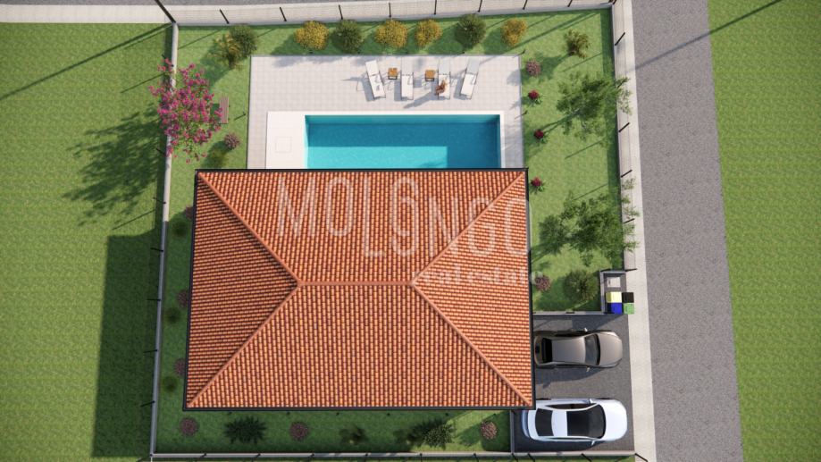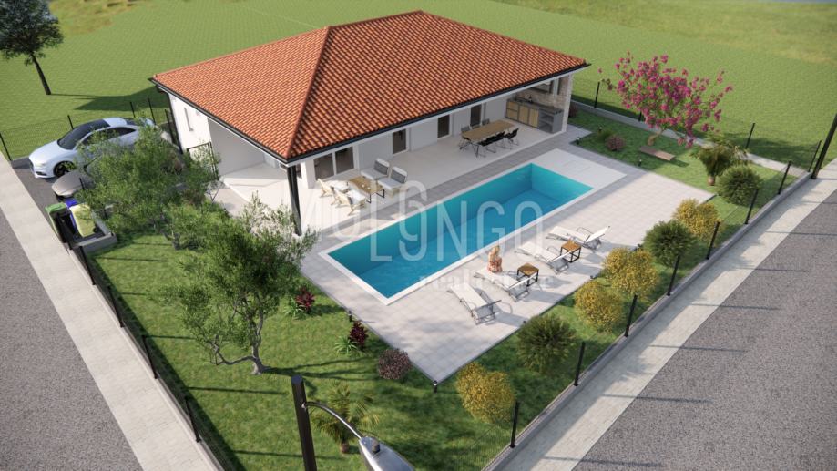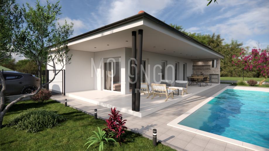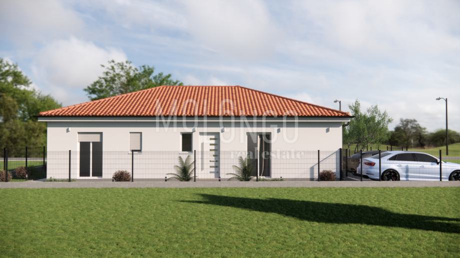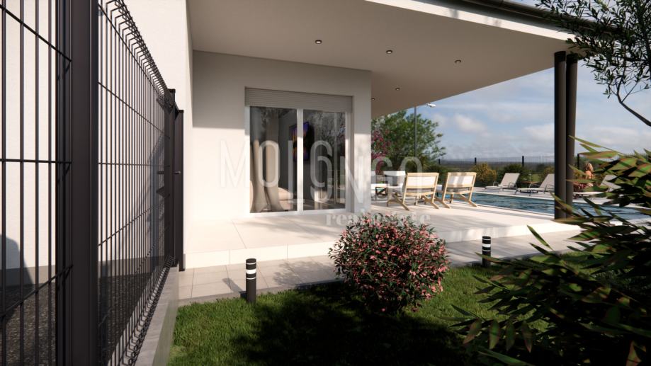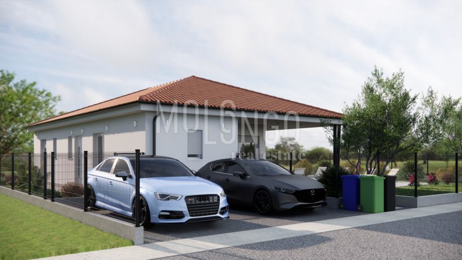 Na prodaju je samostojeća montažna prizemnica u Žminju. Kuća, trenutno u završnoj fazi izgradnje, prostire se na ukupnoj površini od 135 m2. Sastoji se od prostranog dnevnog boravka s kuhinjom i blagovaonicom, stvarajući otvoreni prostor idealan za obiteljska okupljanja i zabavu. Dvije prostrane spavaće sobe, svaka s vlastitom kupaonicom, pružit će vam privatnost i udobnost. Iz dnevnog boravka izlazi se na natkrivenu terasu i bazen.
