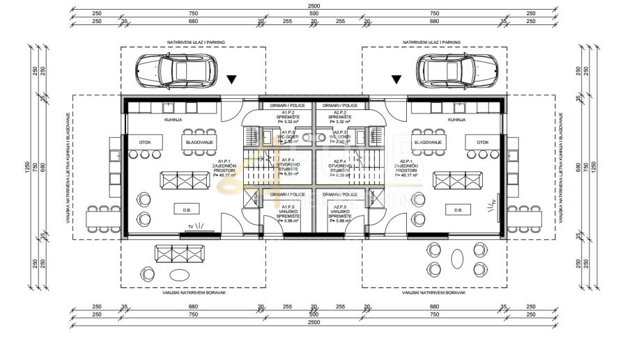 U prizemlju se nalazi ulazna garderoba, veliki dnevni prostor otvorenog koncepta (kuhinja, blagovaonica i dnevni boravak) površine 45.17m2, spremište za namirnice (3.32m2), gostinjski toalet (2.30m2), unutarnje stubište (6.39m2) te dodatno spremište za alat i opremu (5.98m2) koji ima izravni ulaz s okućnice.