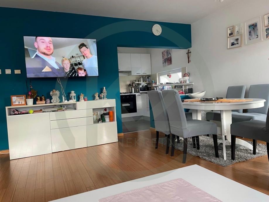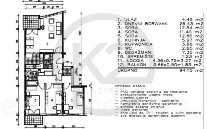 Stan se sastoji od ulaza, dnevni boravak, blagovaona, loggia, kuhinja, 2 kupaone sa WC-om, hodnik sa ugradbenim ormarima, 3 spavaće sobe, balkon.