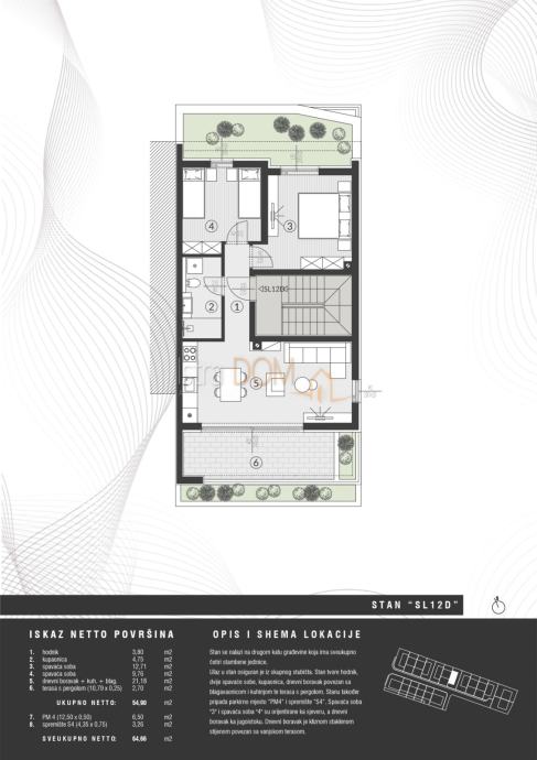 Stan se sastoji od hodnika, dvije spavaće sobe, dnevnog boravka povezanog sa blagovaonicom i kuhinjom, kupatila te terase sa pergolom.
