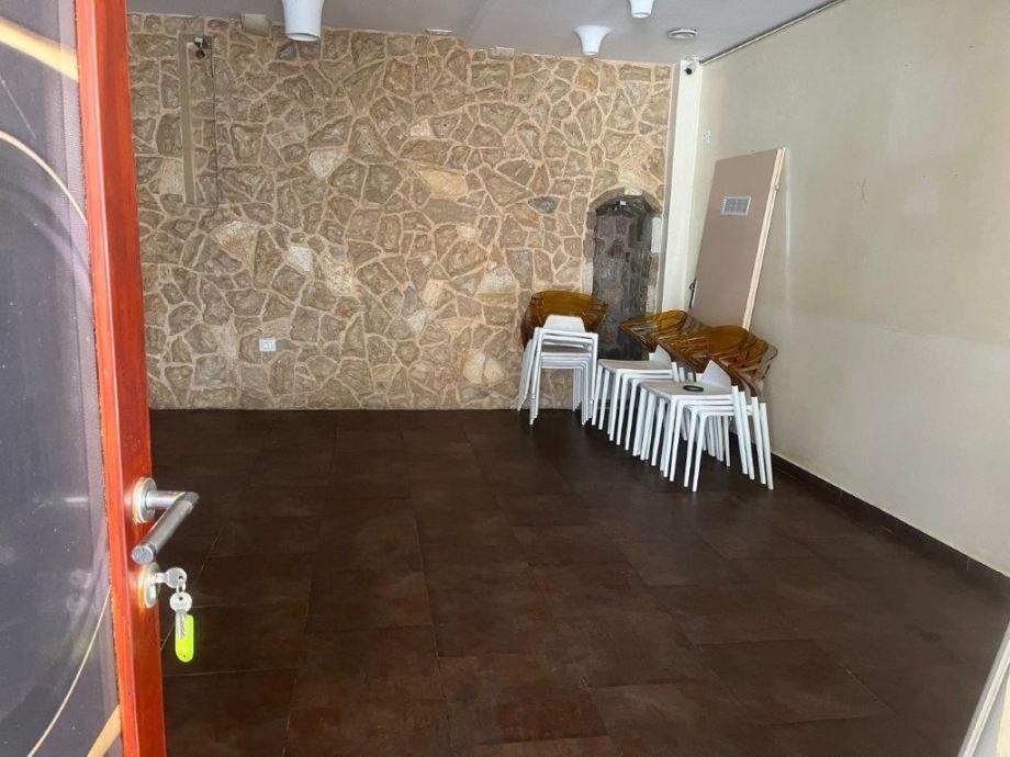 Unutrašnjost je podijeljena na glavni prostor za goste i zaseban sanitarni čvor s toaletima. Zidovi su kombinirani - dio je obložen kamenom u mediteranskom stilu, ostatak je oblogan keramičkim pločicama u sivim tonovima. Pod je popločan tamnom keramikom kroz cijeli prostor. Lokal se predaje prazan, bez ugostiteljske opreme ili namještaja, što daje slobodu u postavljanju interijera prema potrebi.