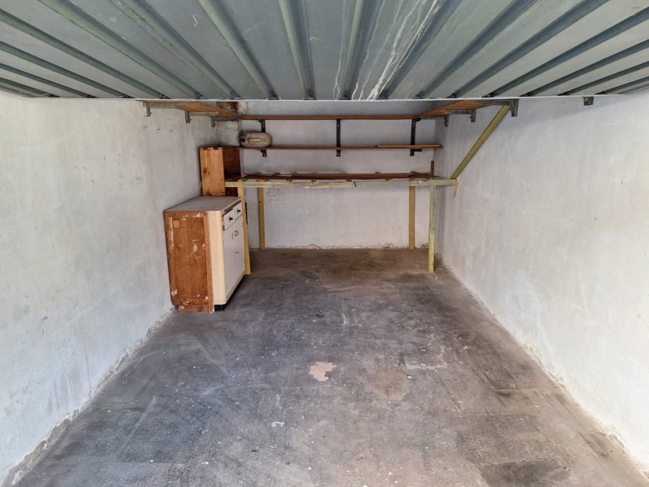 Iznajmljujem betonsku garažu površine 15,3 m² s metalnim vratima. Unutra se nalaze metalne police duž jednog zida, korisne za odlaganje stvari, te dodatni drveni ormarić koji ostaje u prostoru. Pod je betonski.