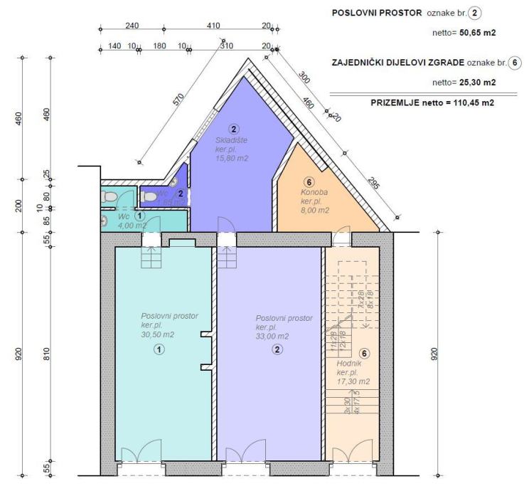Prostor ima lokal od 33 kvadrata a sa skladištem preko 50 kvadrata, vidi priloženi nacrt za prostor br.2, plavo. U prostoru je bila slastičarna, turistička agencija, kozmetični salon i zadnje agencija za nekretnine, tako da je lako ostvariti potrebne uvjete.