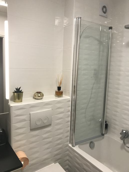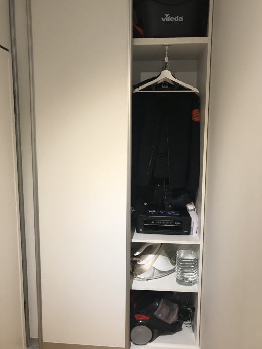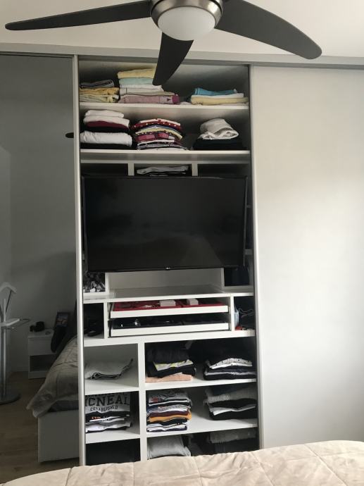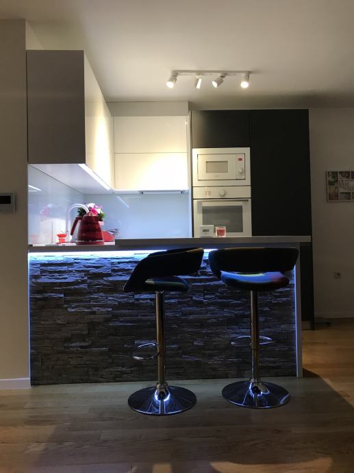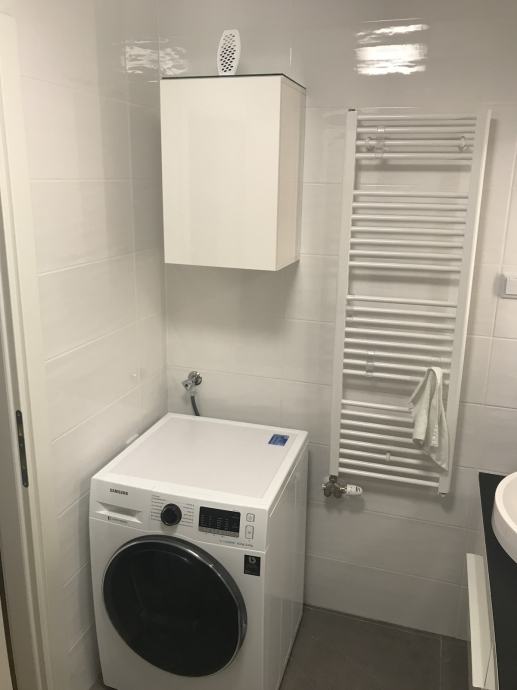 Hodnik sa ogledalom/ormarom za cipele, garderobni ormar, bojler u ormaru… kupatilo sa tuš-kadom, vešmašina/sušilica Samsung. Spavaća soba, krevet 160cm-spremište ispod te ormar sa smart TV LG 107cm, ventilator sa rasvjetom. Dnevni boravak sa smart TV Samsung 165cm, radni stol, kutna na el. razvlačenje, kuhinja sa svim uređajima. Balkon i terasa cca 15m2 sa el. roštiljem, na terasi se nalazi struja za el. vozila te cijev s vodom, izlaz na privatni parking. Klima invertor Daikin wifi, centralno wifi, pvc sa komarnicima. Parking x2.
