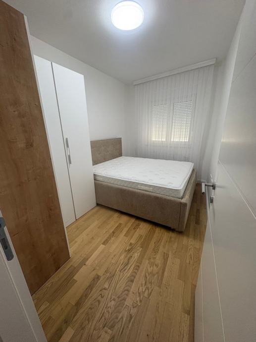 Raspored stana uključuje dvije spavaće sobe, od kojih svaka ima bračni krevet s ormarom, te kupaonicu s tuš kabinom i zasebnim WC-om. Ulazni hodnik opremljen je komodom za obuću i ogledalom. Stan ima balkon i klimatizaciju, a grijanje je etažno plinsko centralno.