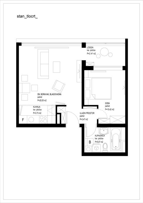 Stan se sastoji iz ulaznog prostora, dnevnog boravka, blagovaonice i kuhinje, spavaće sobe, loggie i kupaonice.