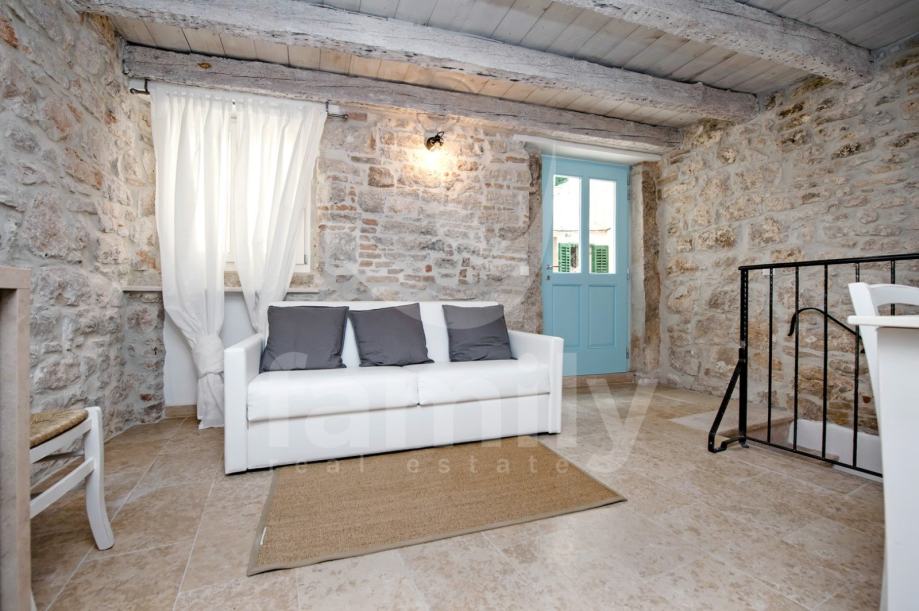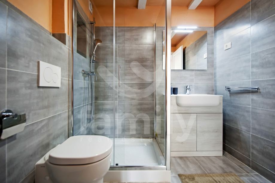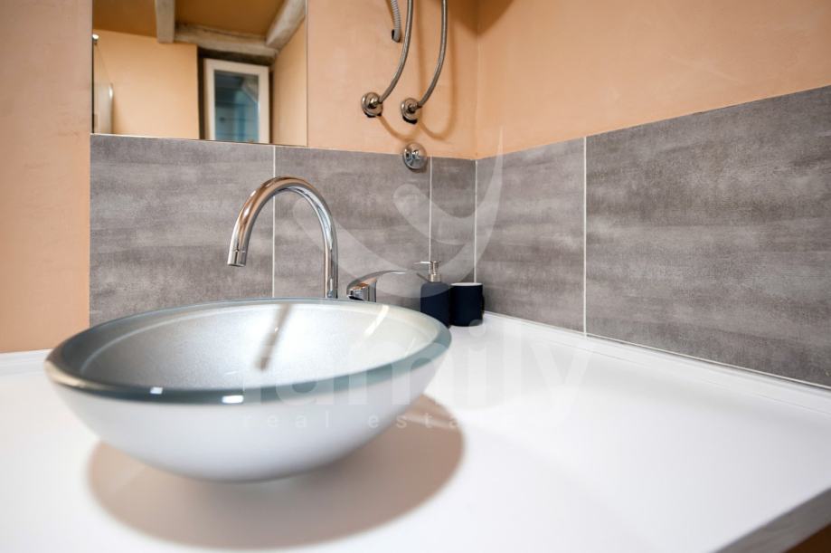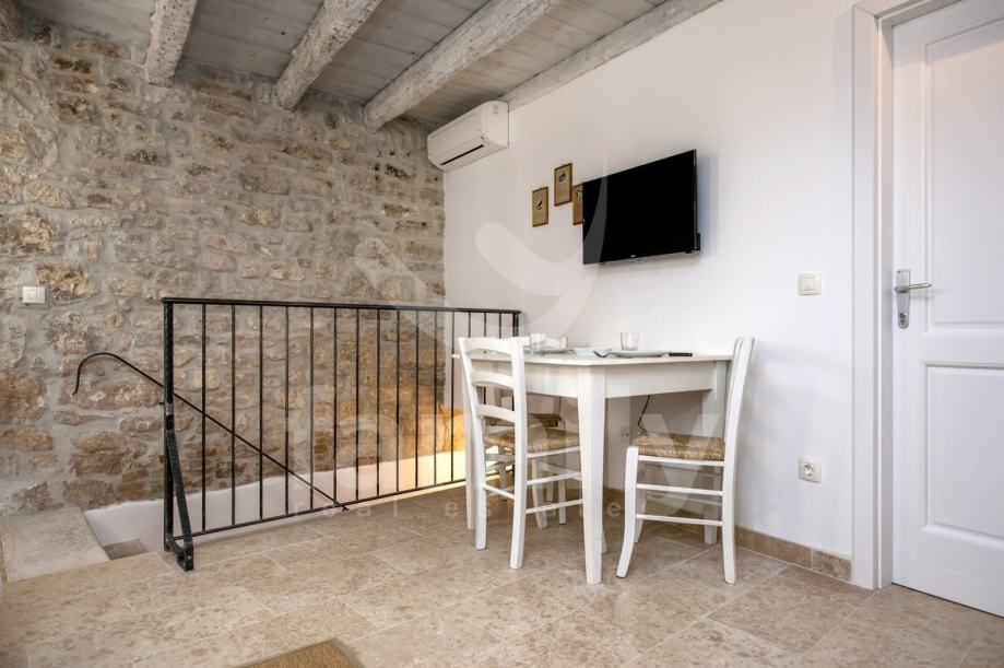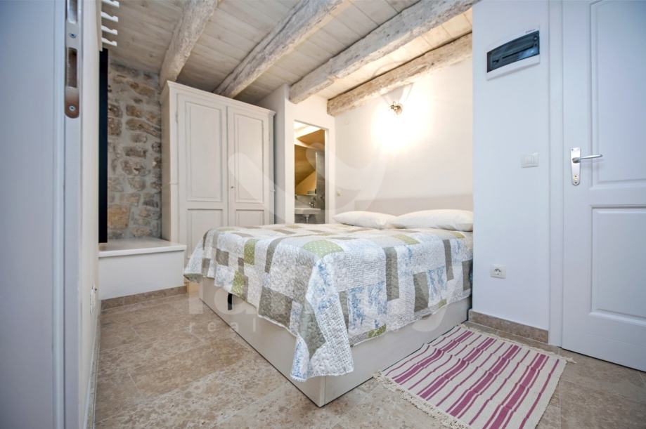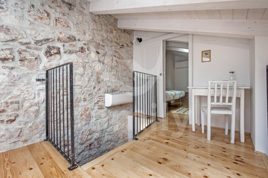 Stan je dizajniran s velikom pažnjom na detalje i kvalitetu materijala. Laminat vrhunske kvalitete prostire se kroz većinu prostora, dok su kupaonice obložene elegantnim i modernim pločicama koje upotpunjuju luksuzni dojam. Drvena stolarija je iznimno kvalitetna, pružajući izvrsnu izolaciju i dodatnu toplinu prostoru. Poseban šarm daju autentični kameni dijelovi, koji su ostavljeni u izvornom obliku, unoseći elemente prošlosti u ovaj moderno uređen prostor.