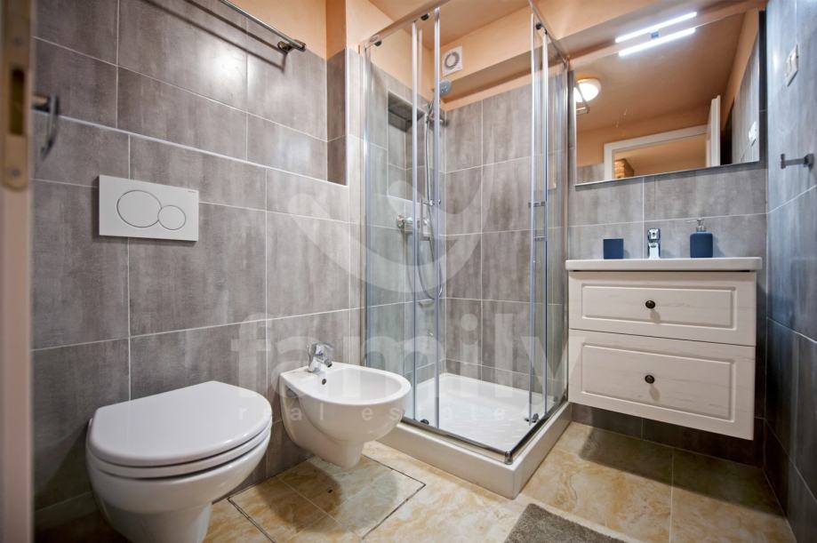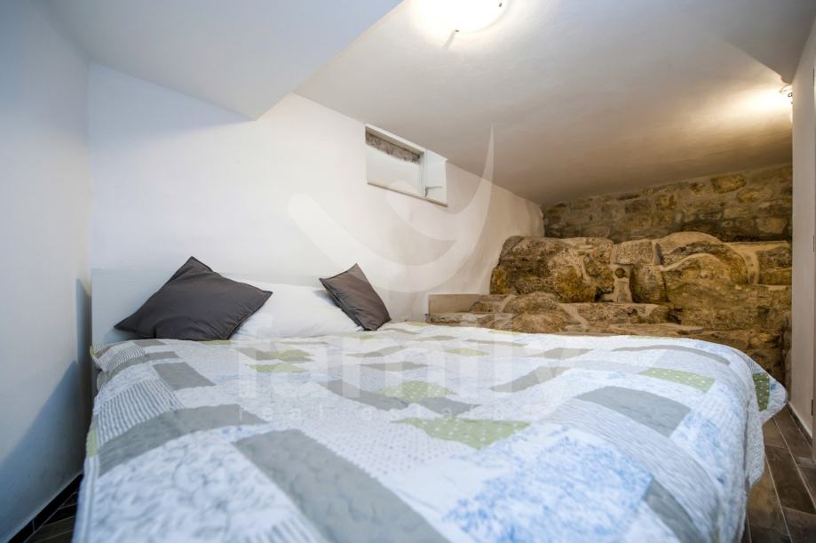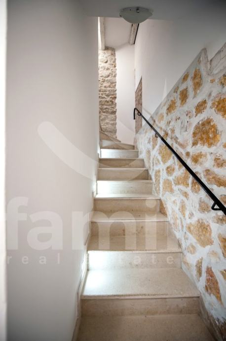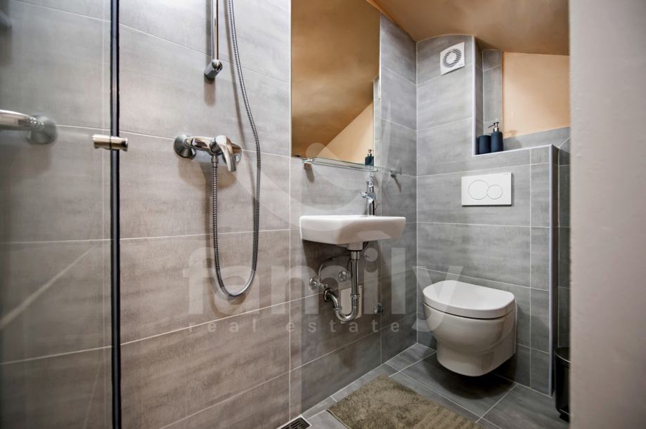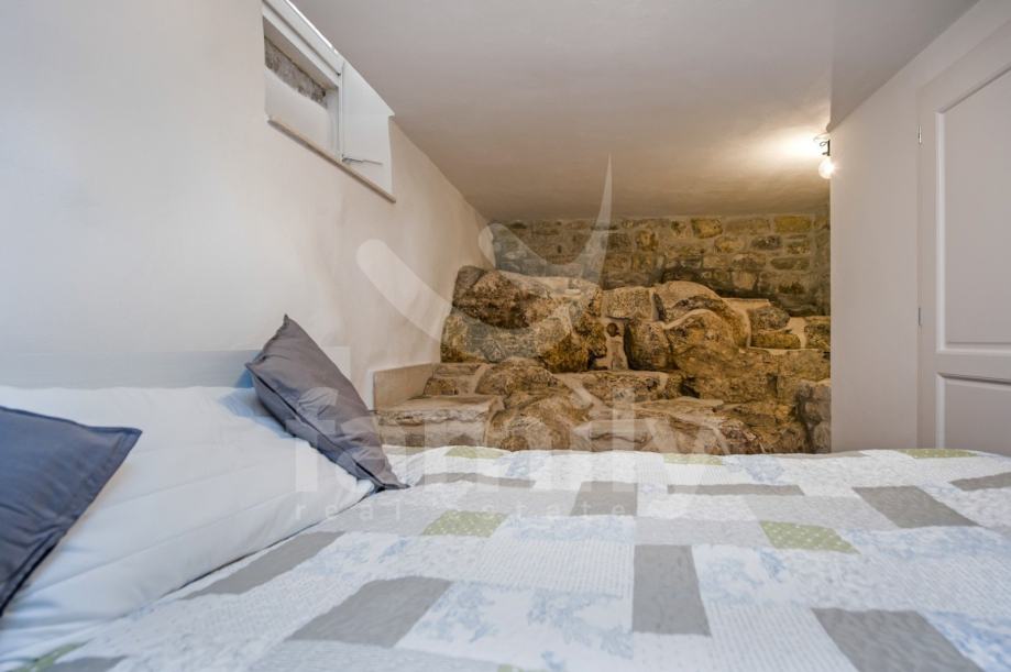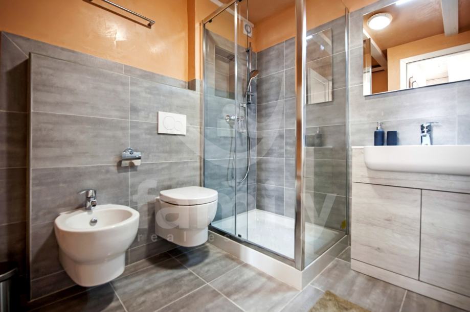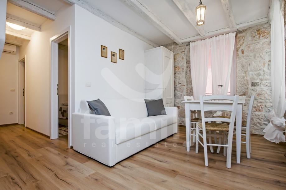 Stan je dizajniran s velikom pažnjom na detalje i kvalitetu materijala. Laminat vrhunske kvalitete prostire se kroz većinu prostora, dok su kupaonice obložene elegantnim i modernim pločicama koje upotpunjuju luksuzni dojam. Drvena stolarija je iznimno kvalitetna, pružajući izvrsnu izolaciju i dodatnu toplinu prostoru. Poseban šarm daju autentični kameni dijelovi, koji su ostavljeni u izvornom obliku, unoseći elemente prošlosti u ovaj moderno uređen prostor.