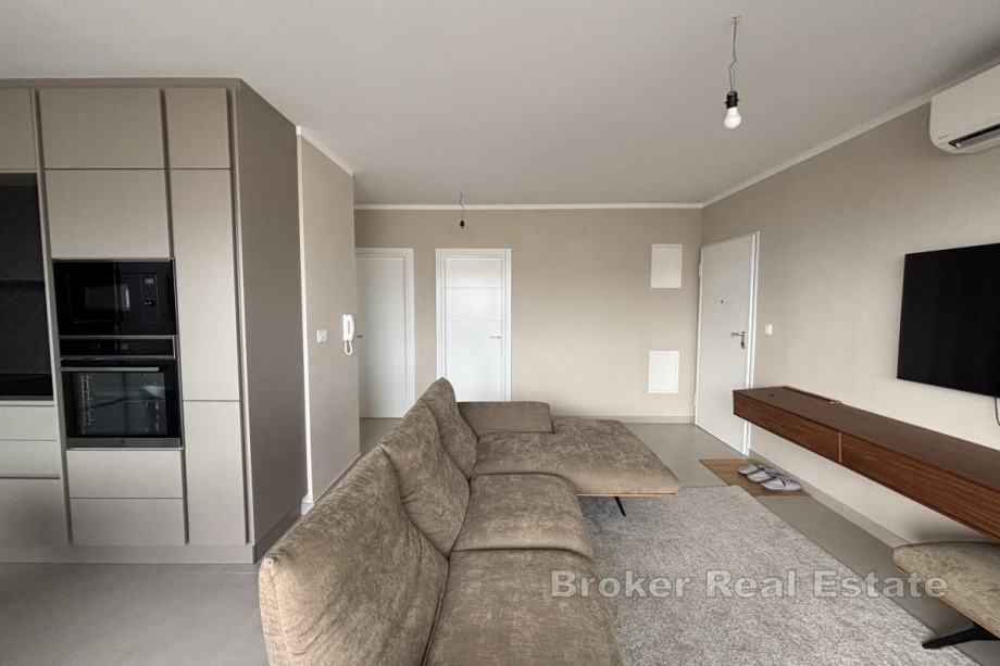 Zgrada je izgrađena korištenjem visokokvalitetnih materijala, a klimatizacija je osigurana putem tri klima uređaja te podnog grijanja u cijelom stanu. Od dodatne opreme ističu se protuprovalna vrata, komarice, električni podizači roleta te kvalitetan namještaj i oprema u stanu koji dolaze uz njega. Ispred zgrade se nalazi vanjsko pripadajuće parkirno mjesto.