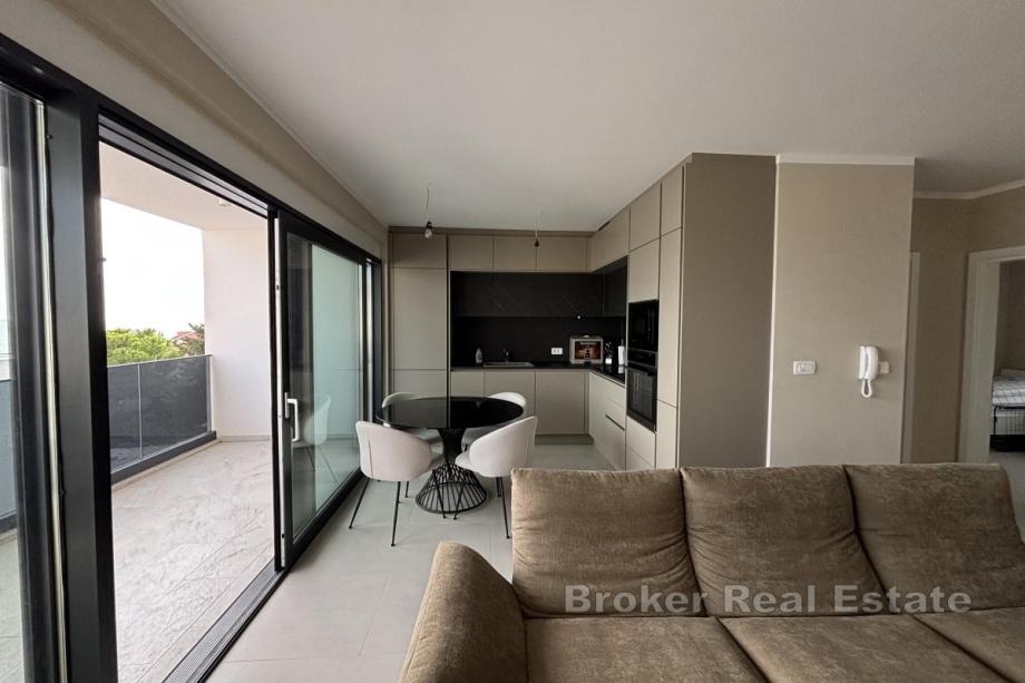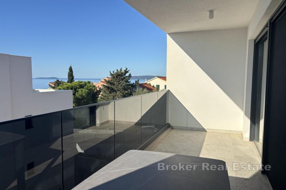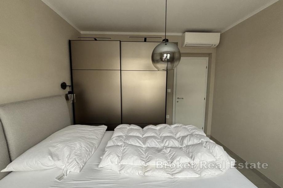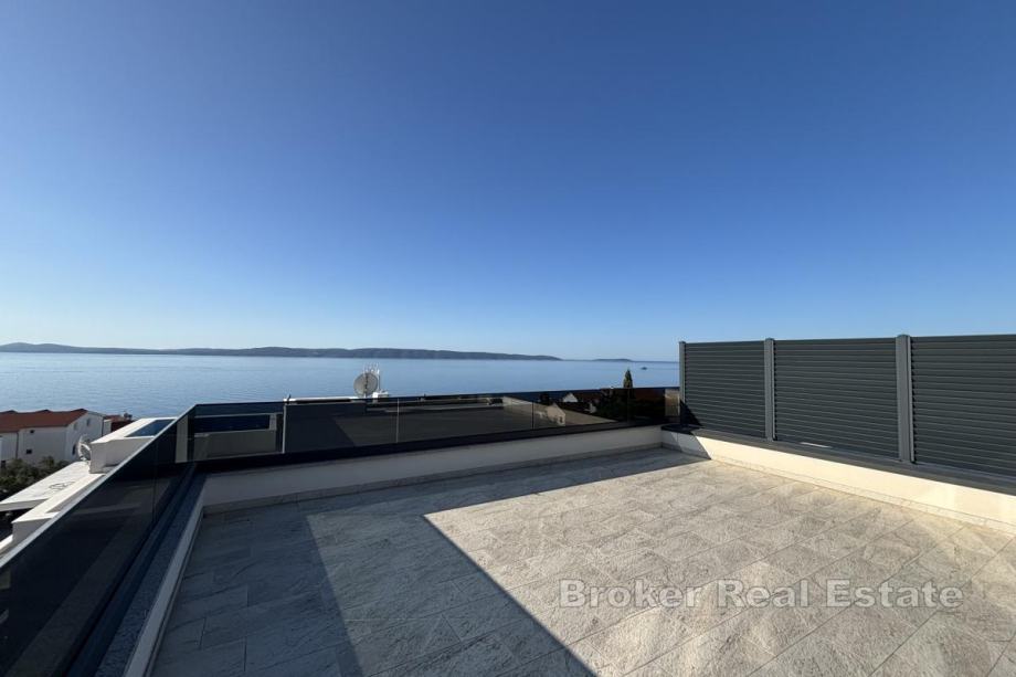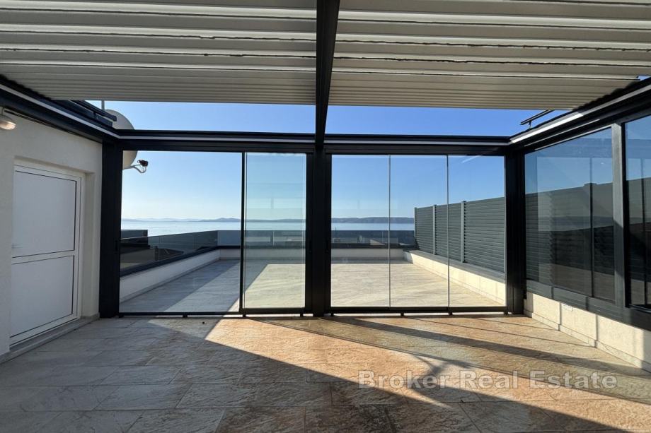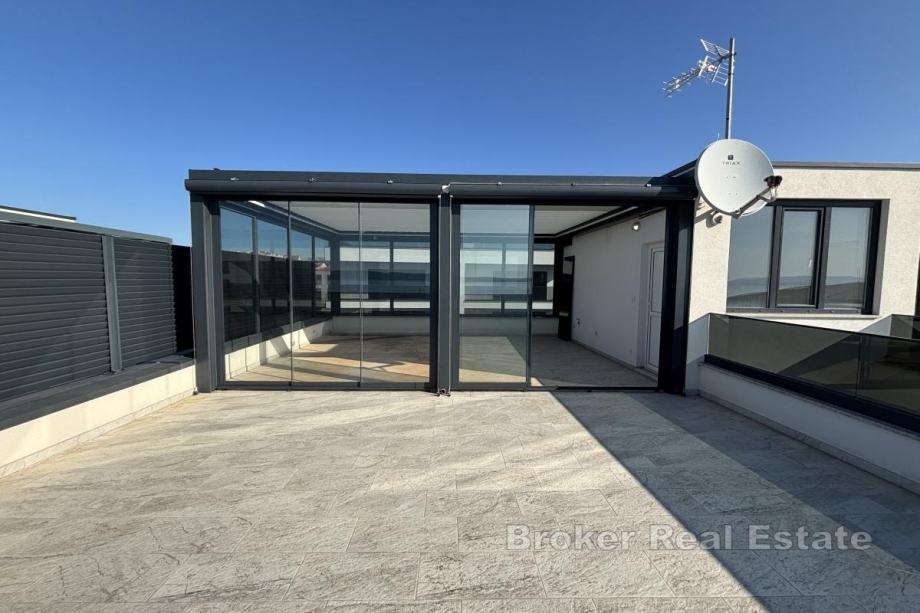 Penthouse je smješten na drugom katu novogradnje suvremenog dizajna, orijentiran je prema jugu i sjeveru, što osigurava obilje prirodne svjetlosti i prekrasan pogled na more u dnevnom dijelu te ugodnu temperaturu u spavaćim sobama. Stan raspolaže s 53,07 m² stambene površine i sastoji se od dvije spavaće sobe, kupaonice, kuhinje, blagovaonice i dnevnog boravka iz kojega se izlazi na lođu s pogledom na more površine 12,71 m². Najveća prednost ove nekretnine je prostrana krovna terasa površine 68,90 m², koja pruža spektakularan panoramski pogled na more i obližnje otoke – idealno mjesto za vanjsko druženje. Na njoj se nalazi ostakljena bioklimatska pergola idealna za boravak tijekom cijele godine te izvodi za ugradnju ljetne kuhinje i masažne kade.
