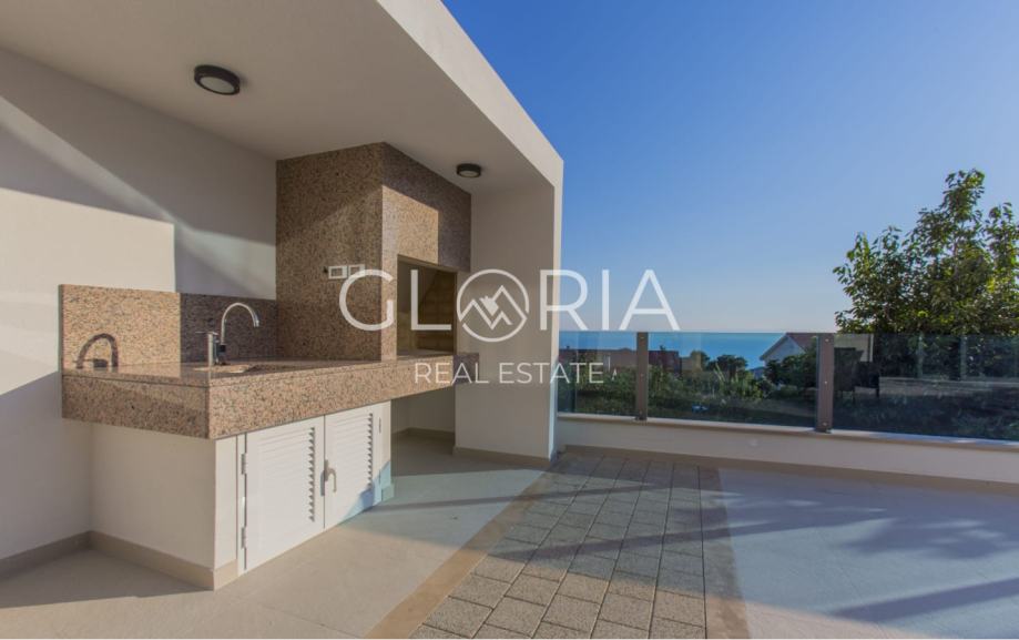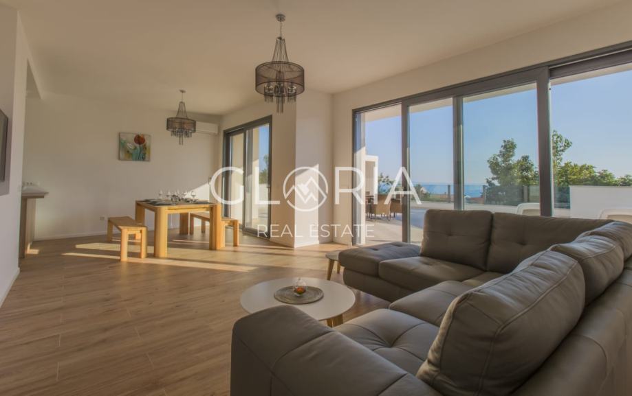 Elegantno kamenim stubištem dolazite do prizemlja, gdje se nalazi automatizirana garaža. Prizemlje uključuje prostrani dnevni boravak, kuhinju s terasom i fantastičnim pogledom, te kupaonicu.