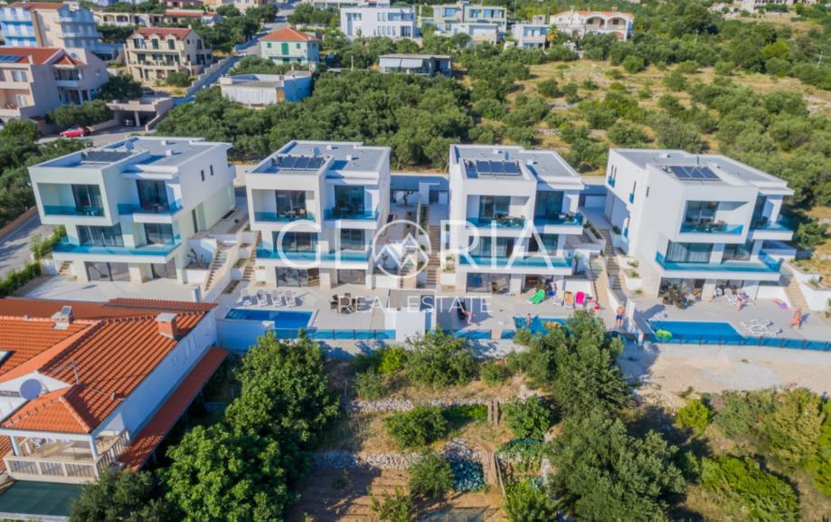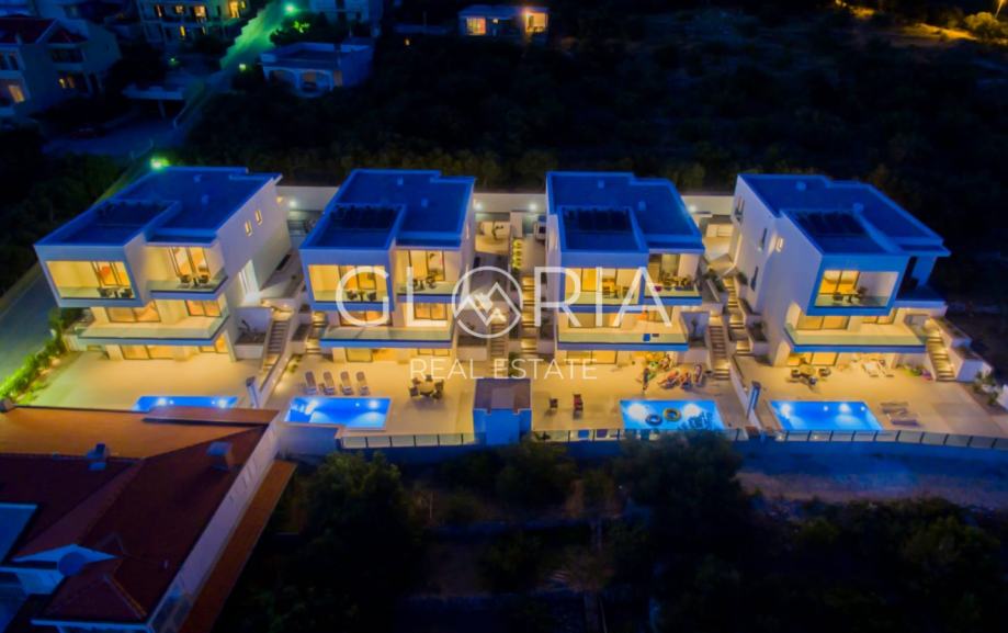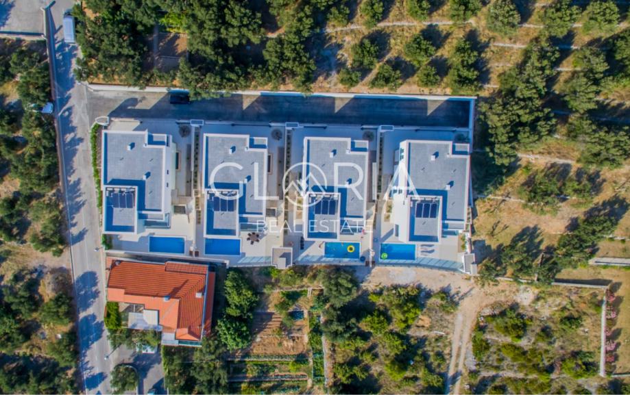 Svaka villa prostire se na oko 350 m² savršeno iskorištenog prostora, uz parcele od 420 m². Uživajte u predivnom pogledu na more i otoke s jedne strane, te zadivljujućim pejzažem planine Biokovo s druge. Zidovi su obloženi slojem staklene vune debljine 8-10 cm, što osigurava vrhunsku izolaciju i udobnost tijekom cijele godine.