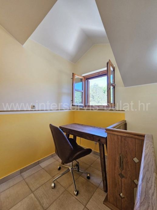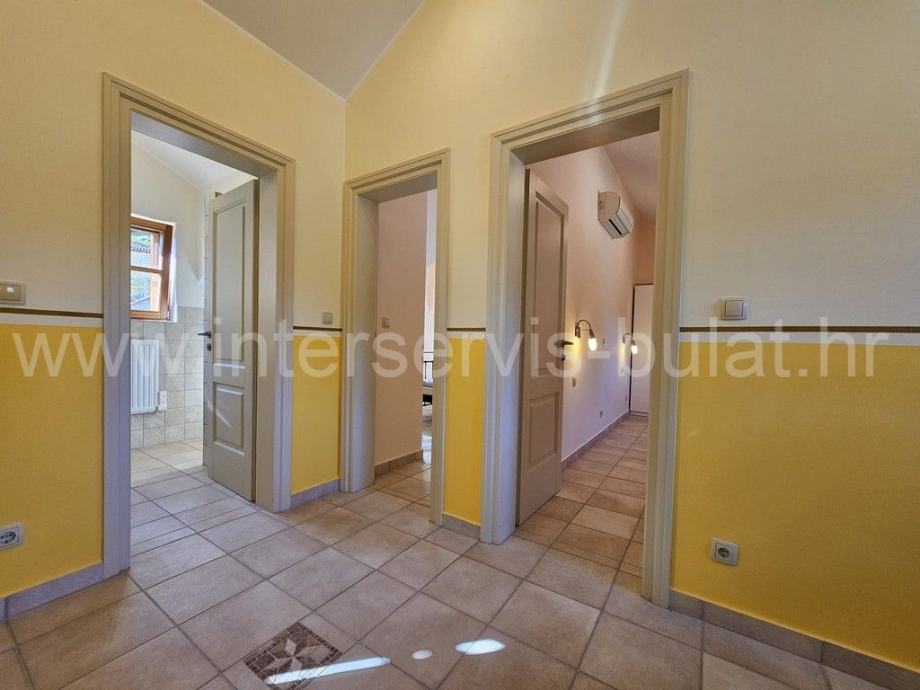 Na lijepoj i mirnoj lokaciji u Skradinu smjestila se autohtona katnica. Blago strma lokacija omogućava prekrasan pogled na Skradin. Kuća se prostire kroz prizemlje, kat i visoko potkrovlje, te raspolaže sa oko 150m2 stambenog prostora. U prizemlju nalazimo hodnik, toalet, kuhinju sa blagovaonicom i dnevnim boravkom i stepenicama za kat. Iz kuhinje vodi izlaz u stražnje intimno dvorište gdje se nalazi terasa, ostava i stepenice koje vode do kata. Kat raspolaže sa glavnom spavaćom sobom koja posjeduje svoju veliku kupaonicu, posebnim toaletom i izlazom na terasu sa pogledom na dvorište kuće kao i na sam Skradin. U visokom potkrovlju su smještene dvije spavaće sobe, kupaonica, toalet, te hodnik sa radnim uredskim prostorom. Cijela kuća je građena i opremljena vrlo kvalitetno, od drvene stolarije sa griljama i komaricama, podova, keramike, sanitarija, centralnog grijanja pa do vanjske balkonske ograde od kovanog željeza. Kuća je namještena i opremljena s ukusom i u duhu autohtonosti.