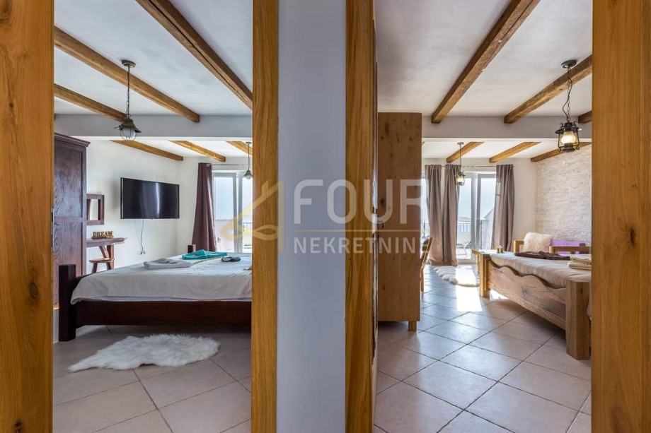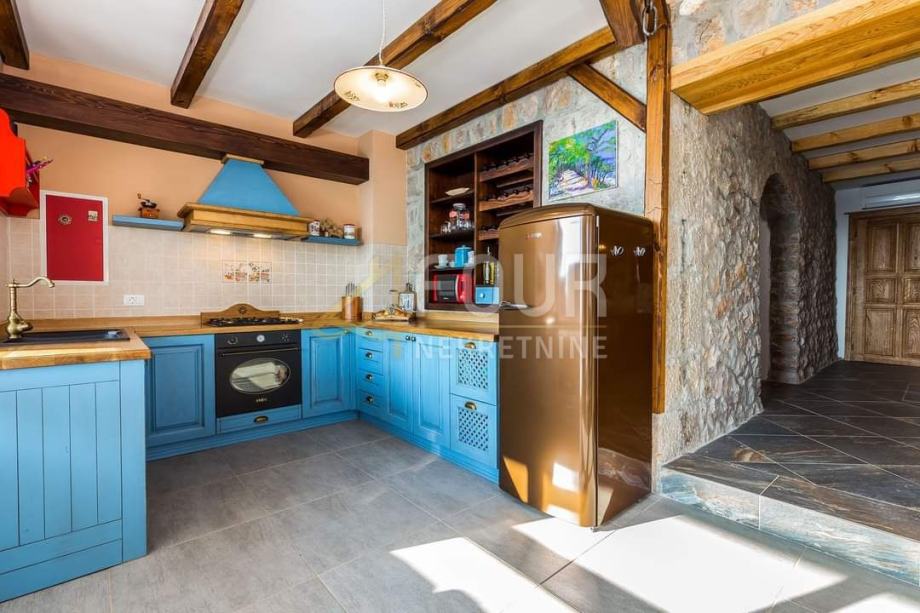 Kuća je vrlo lijepo uređena s detaljima rustikalnog stila koji daje dodatnu toplinu ovoj primorskoj kući.