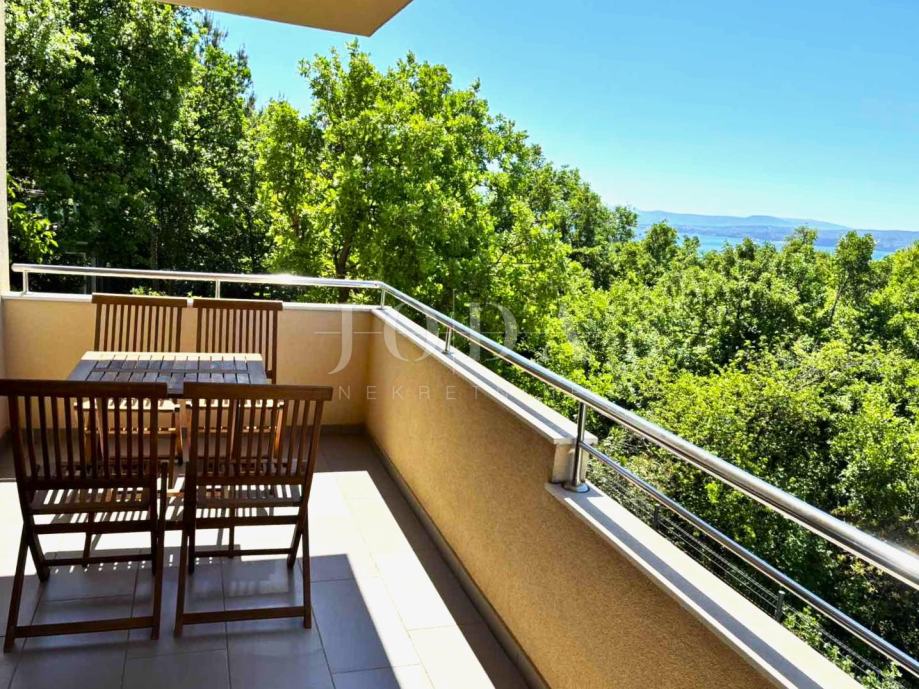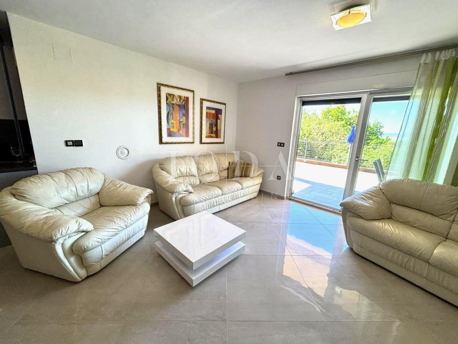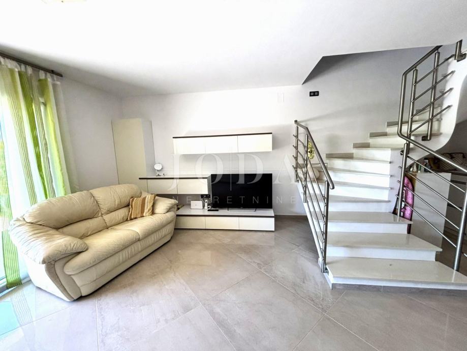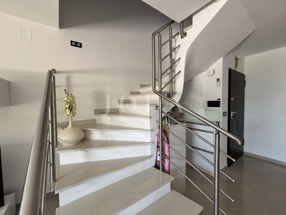 Stan se prostire na dvije etaže. U prizemlju se nalazi prostrani open-space dnevni boravak s kuhinjom i blagovaonicom, uređena kupaonica te jedna spavaća soba. Iz dnevnog boravka izlazi se na veliku terasu s pogledom na more.
